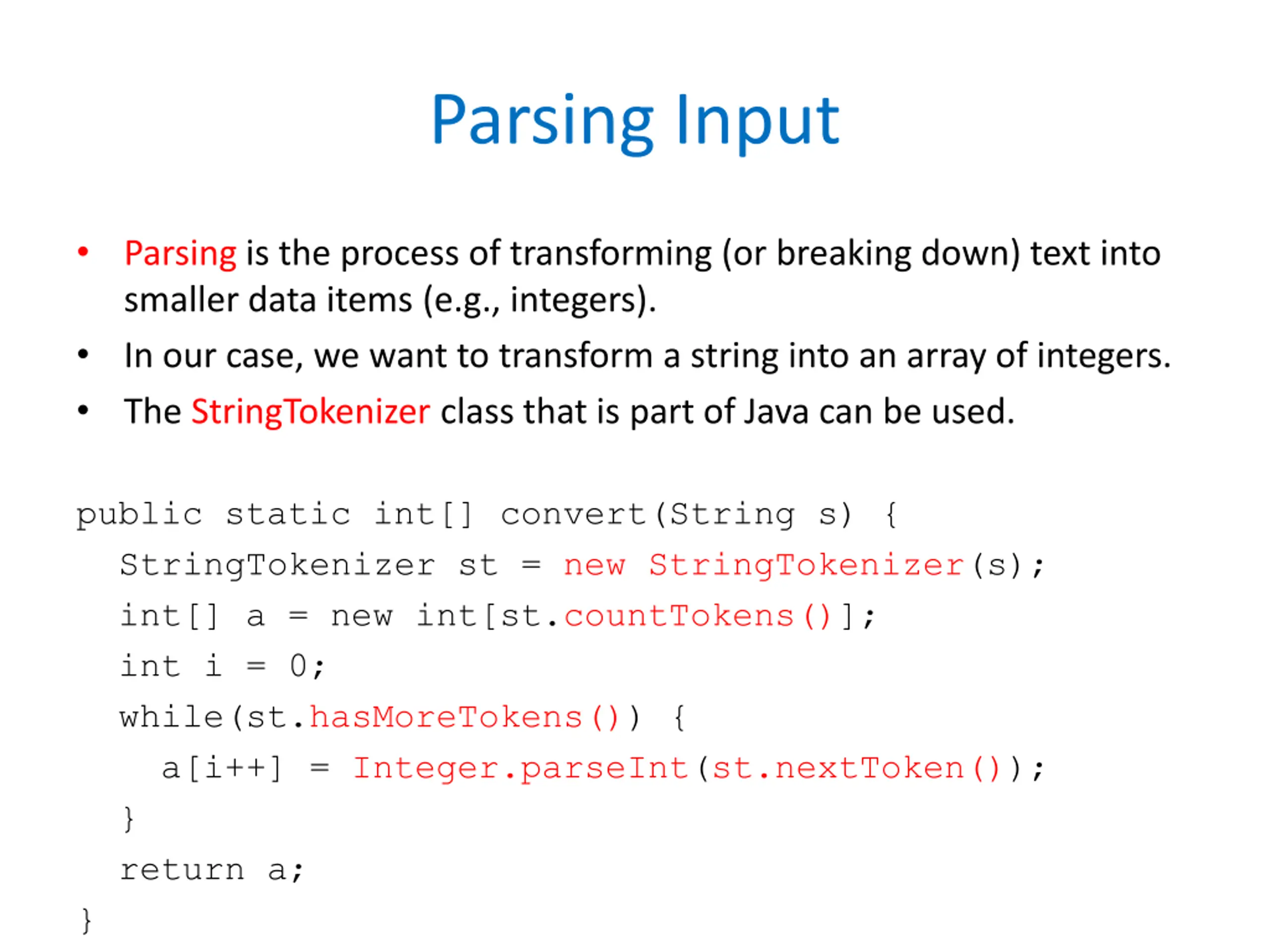 Parsing Input Parsing is the process of transforming (or breaking down) text into smaller data items (e.g., integers). In our case, we want to transform a string into an array of integers. The StringTokenizer class that is part of Java can be used. public static int[] convert(String s) { StringTokenizer st = new StringTokenizer(s); int[] a = new int[st.countTokens()]; int i = 0; while(st.hasMoreTokens()) { a[i++] = Integer.parseInt(st.nextToken()); } return a; }