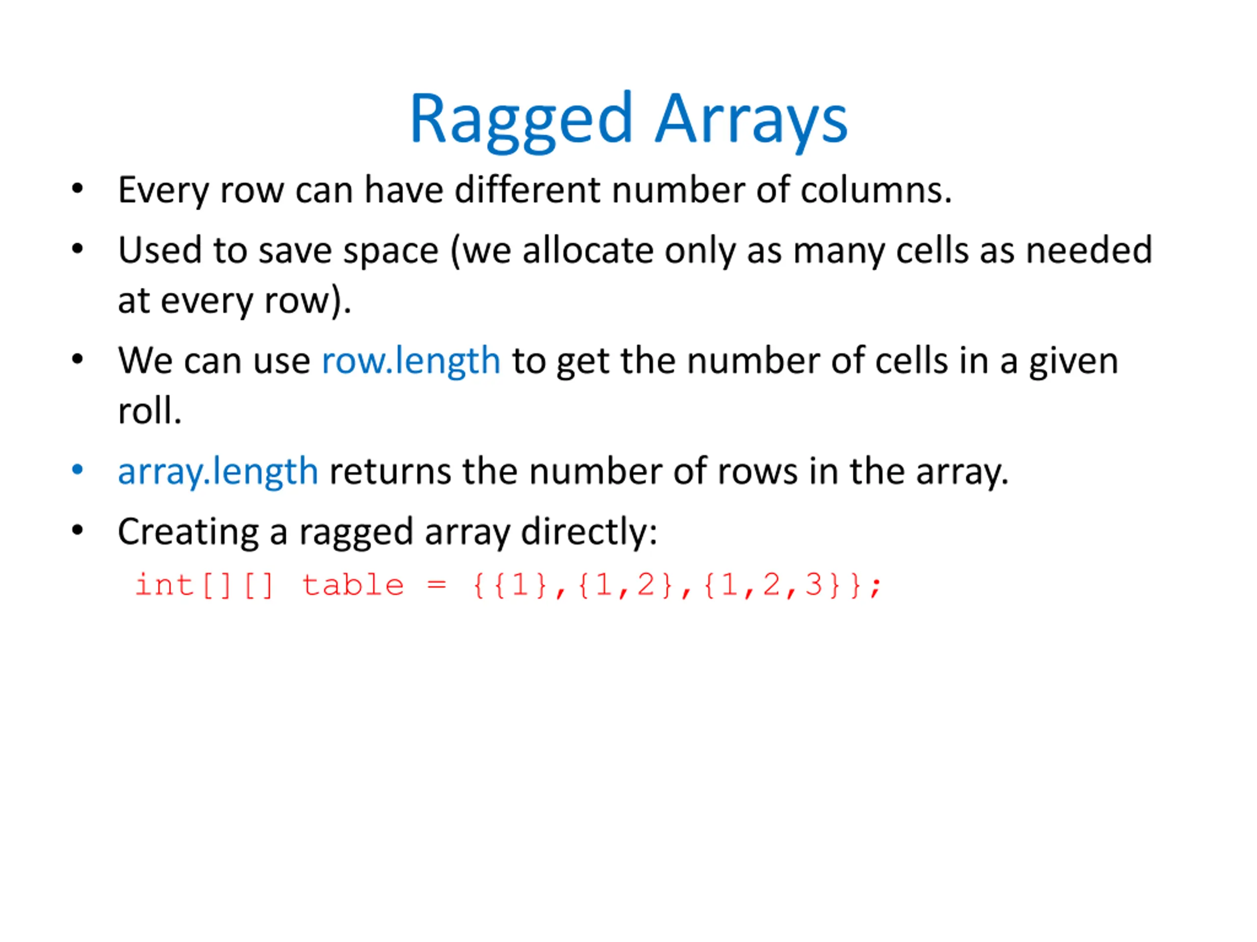 Ragged Arrays Every row can have different number of columns. Used to save space (we allocate only as many cells as needed at every row). We can use row.length to get the number of cells in a given roll. array.length returns the number of rows in the array. Creating a ragged array directly: int[][] table = {{1},{1,2},{1,2,3}};