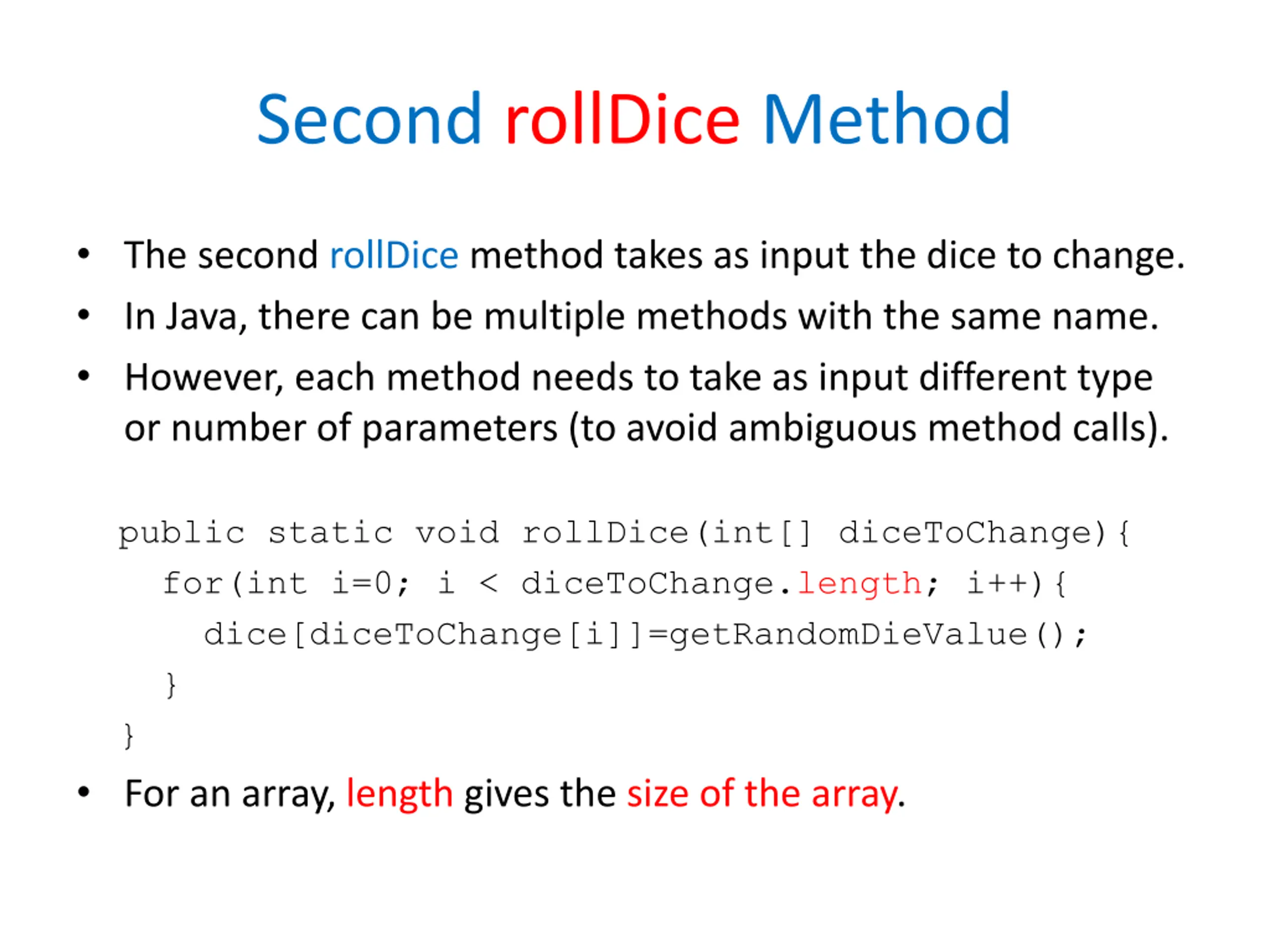 Second rollDice Method The second rollDice method takes as input the dice to change. In Java, there can be multiple methods with the same name. However, each method needs to take as input different type or number of parameters (to avoid ambiguous method calls). public static void rollDice(int[] diceToChange){ for(int i=0; i < diceToChange.length; i++){ dice[diceToChange[i]]=getRandomDieValue(); } } For an array, length gives the size of the array.
