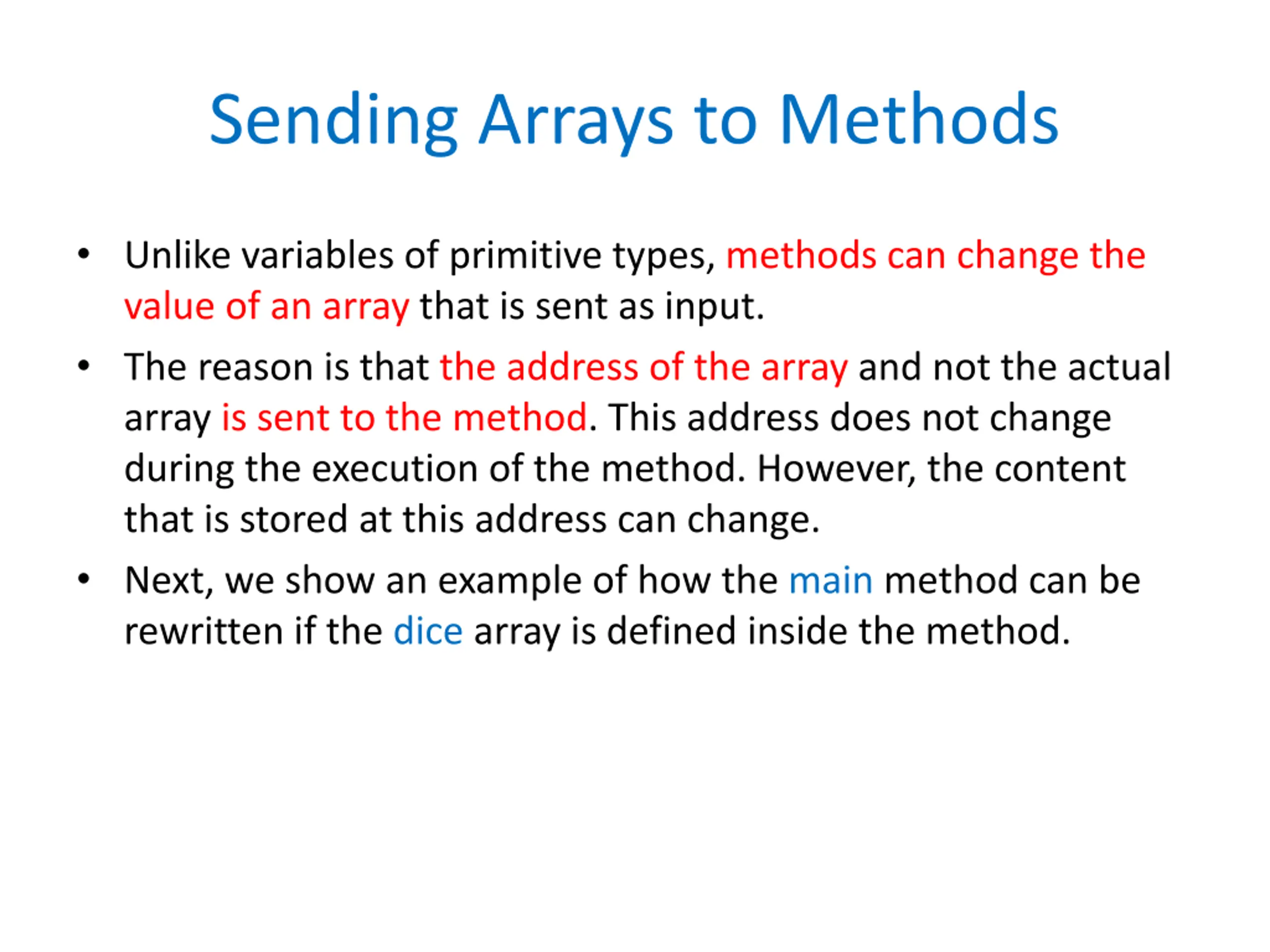 Sending Arrays to Methods Unlike variables of primitive types, methods can change the value of an array that is sent as input. The reason is that the address of the array and not the actual array is sent to the method. This address does not change during the execution of the method. However, the content that is stored at this address can change. Next, we show an example of how the main method can be rewritten if the dice array is defined inside the method.