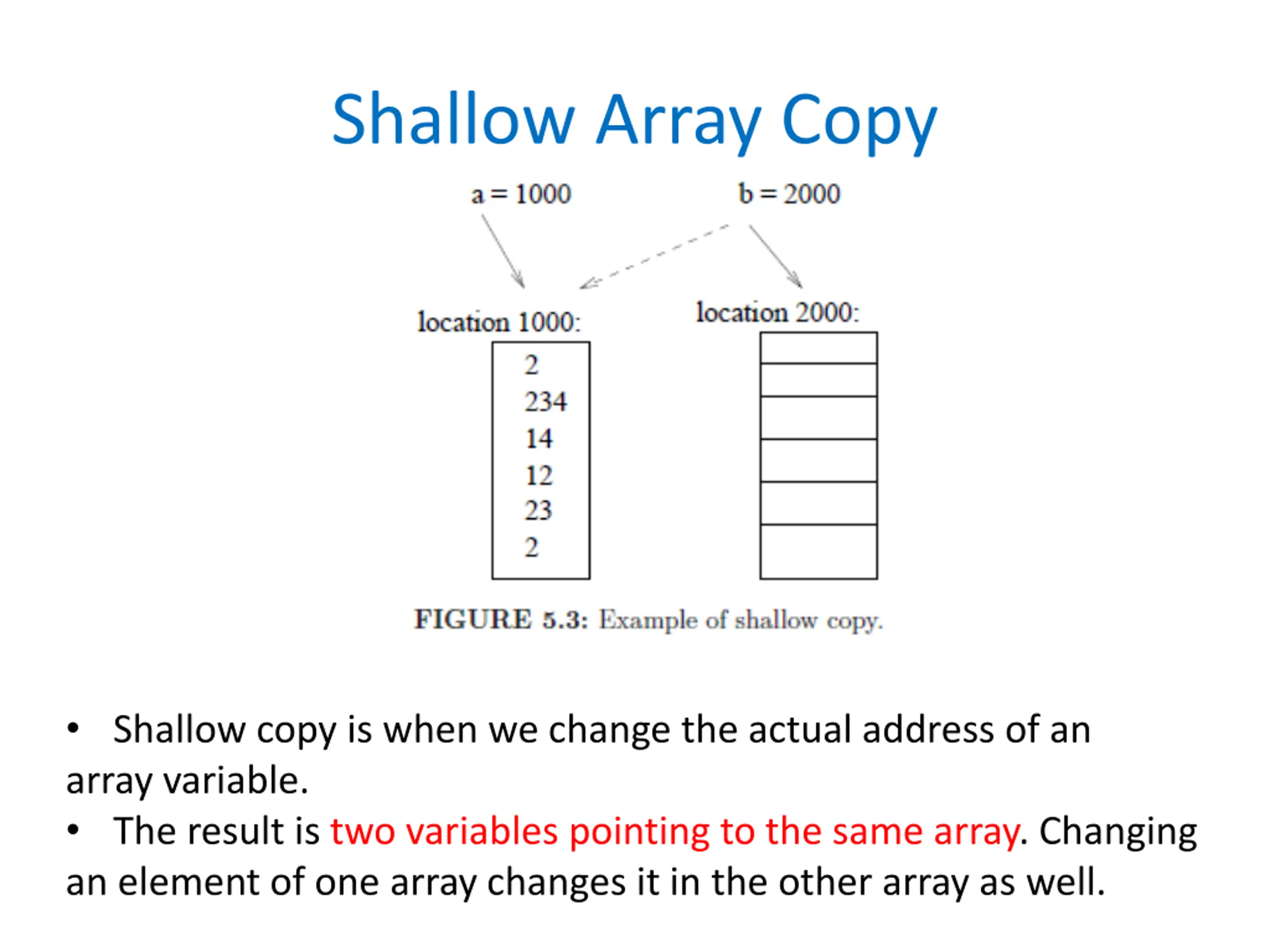 Shallow Array Copy Shallow copy is when we change the actual address of an array variable. The result is two variables pointing to the same array. Changing an element of one array changes it in the other array as well.