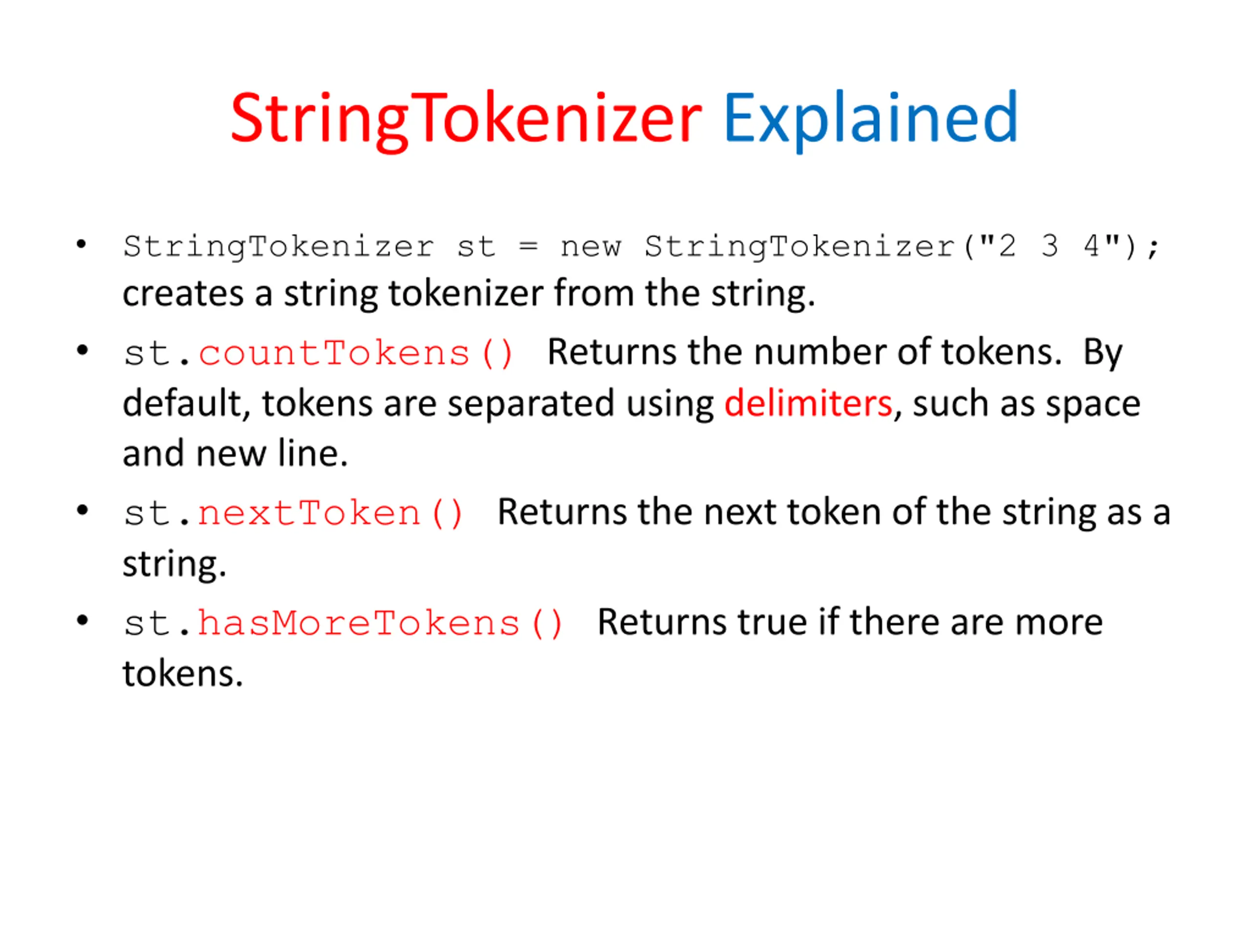 StringTokenizer Explained StringTokenizer st = new StringTokenizer("2 3 4"); creates a string tokenizer from the string. st.countTokens() Returns the number of tokens. By default, tokens are separated using delimiters, such as space and new line. st.nextToken() Returns the next token of the string as a string. st.hasMoreTokens() Returns true if there are more tokens.