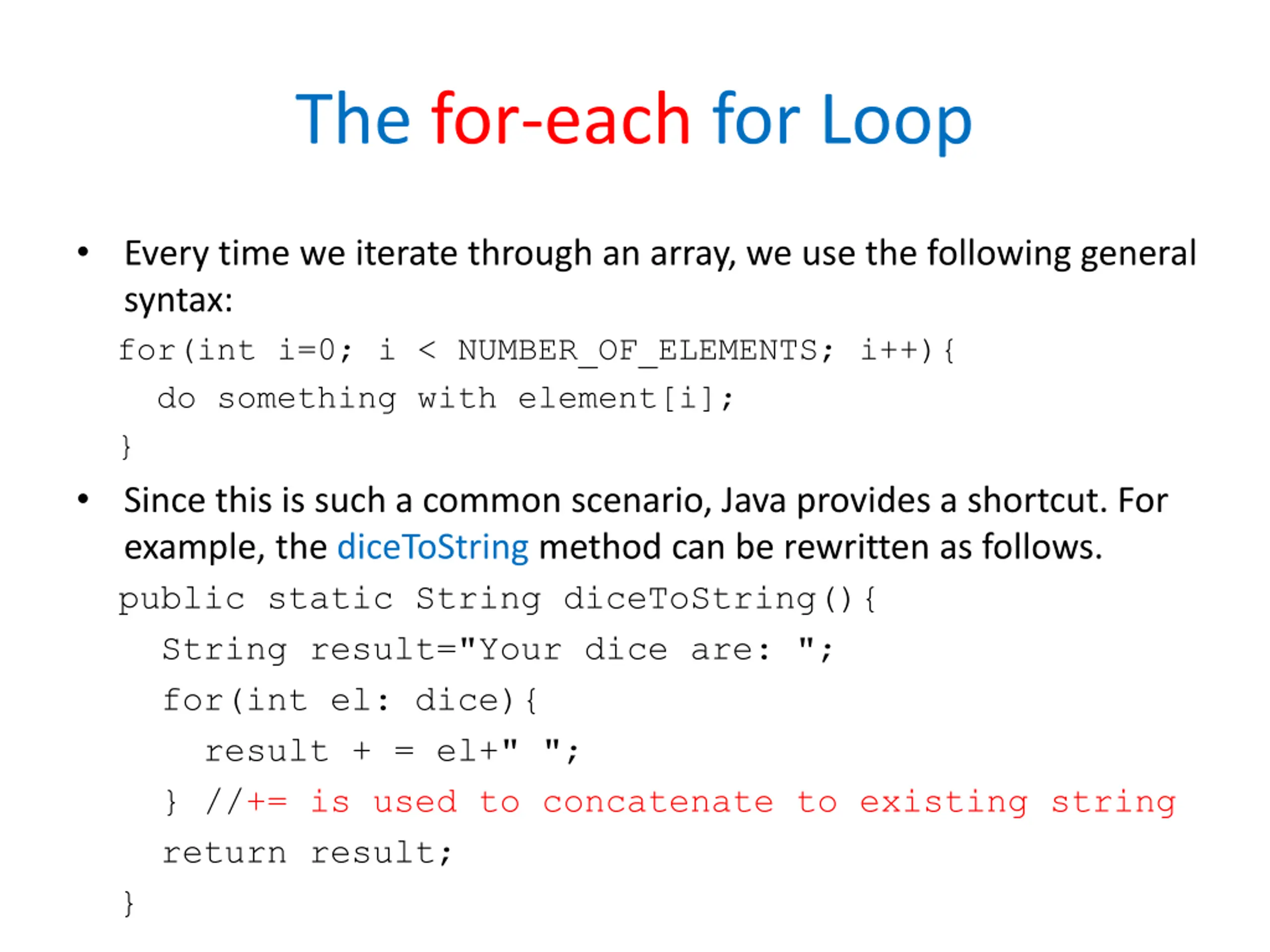 The for-each for Loop Every time we iterate through an array, we use the following general syntax: for(int i=0; i < NUMBER_OF_ELEMENTS; i++){ do something with element[i]; } Since this is such a common scenario, Java provides a shortcut. For example, the diceToString method can be rewritten as follows. public static String diceToString(){ String result="Your dice are: "; for(int el: dice){ result + = el+" "; } //+= is used to concatenate to existing string return result; }