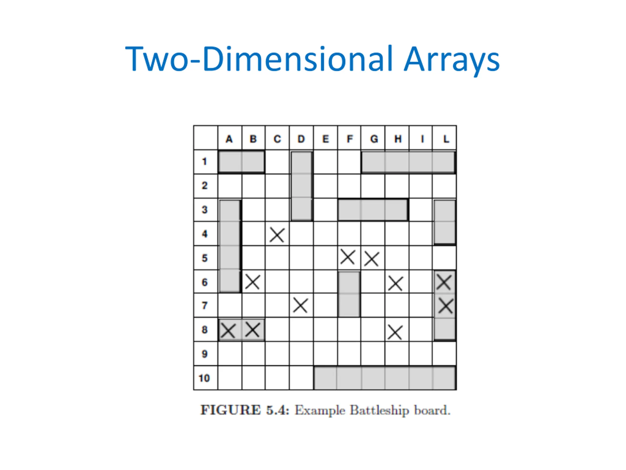 Two-Dimensional Arrays (cont'd) To create a 10x10 array: boolean board[][] = new boolean[10][10]; counting always starts at 0! a[row][column] = value; board[3][3]=true; board[3][4]=true; board[3][5]=true; board[3][6]=true;