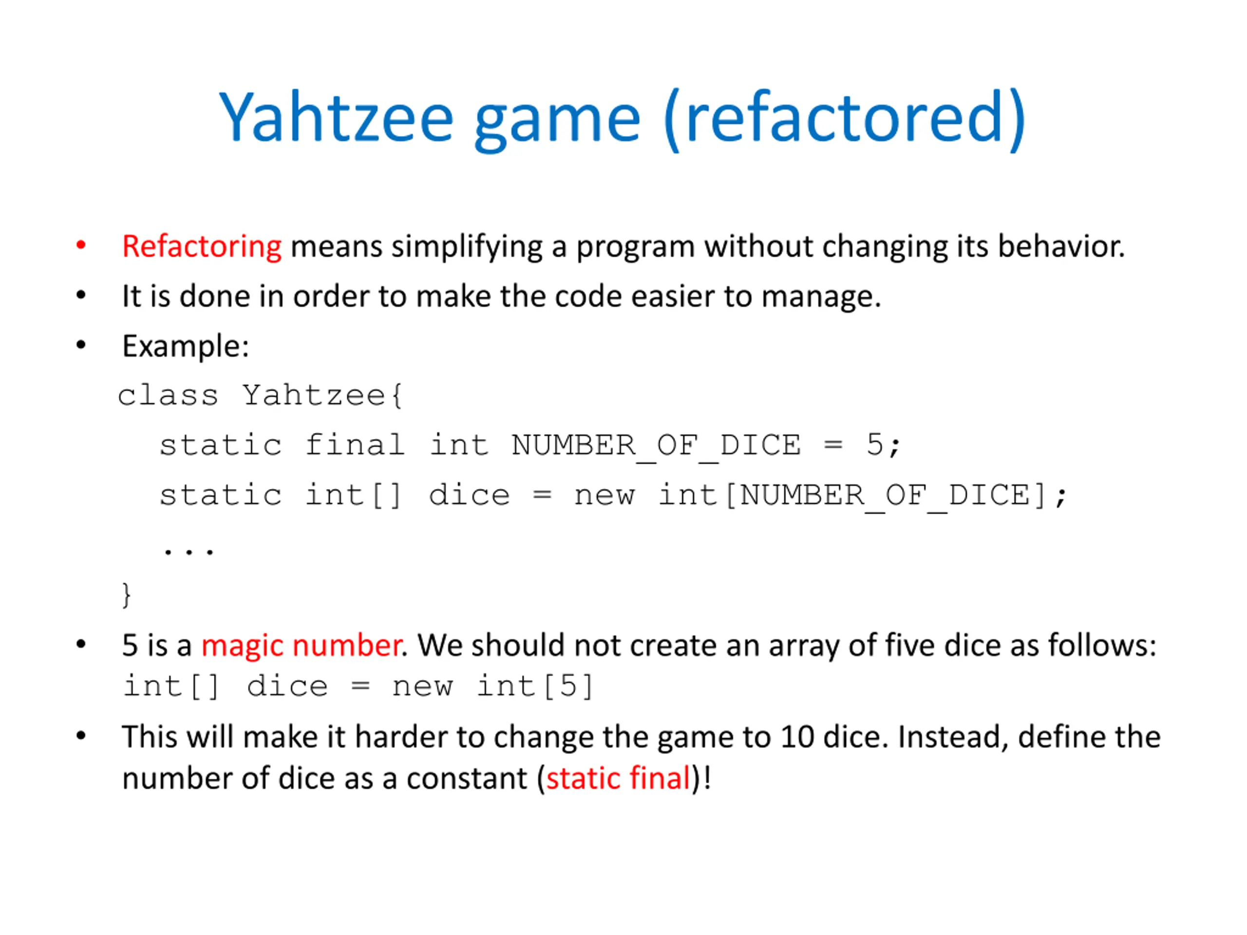 Yahtzee game (refactored) class Yahtzee{ static final int NUMBER_OF_DICE = 5; static int[] dice = new int[NUMBER_OF_DICE]; ... } 5 is a magic number. We should not create an array of five dice as follows: int[] dice = new int[5] This will make it harder to change the game to 10 dice. Instead, define the number of dice as a constant (static final)! Refactoring means simplifying a program without changing its behavior. It is done in order to make the code easier to manage. Example: