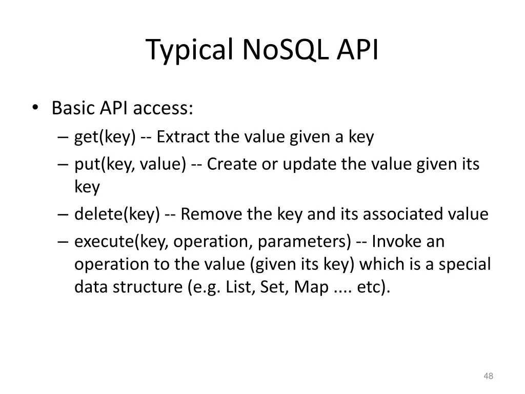 Typical NoSQL API Basic API access: get(key) -- Extract the value given a key put(key, value) -- Create or update the value given its key delete(key) -- Remove the key and its associated value execute(key, operation, parameters) -- Invoke an operation to the value (given its key) which is a special data structure (e.g. List, Set, Map .... etc). 48