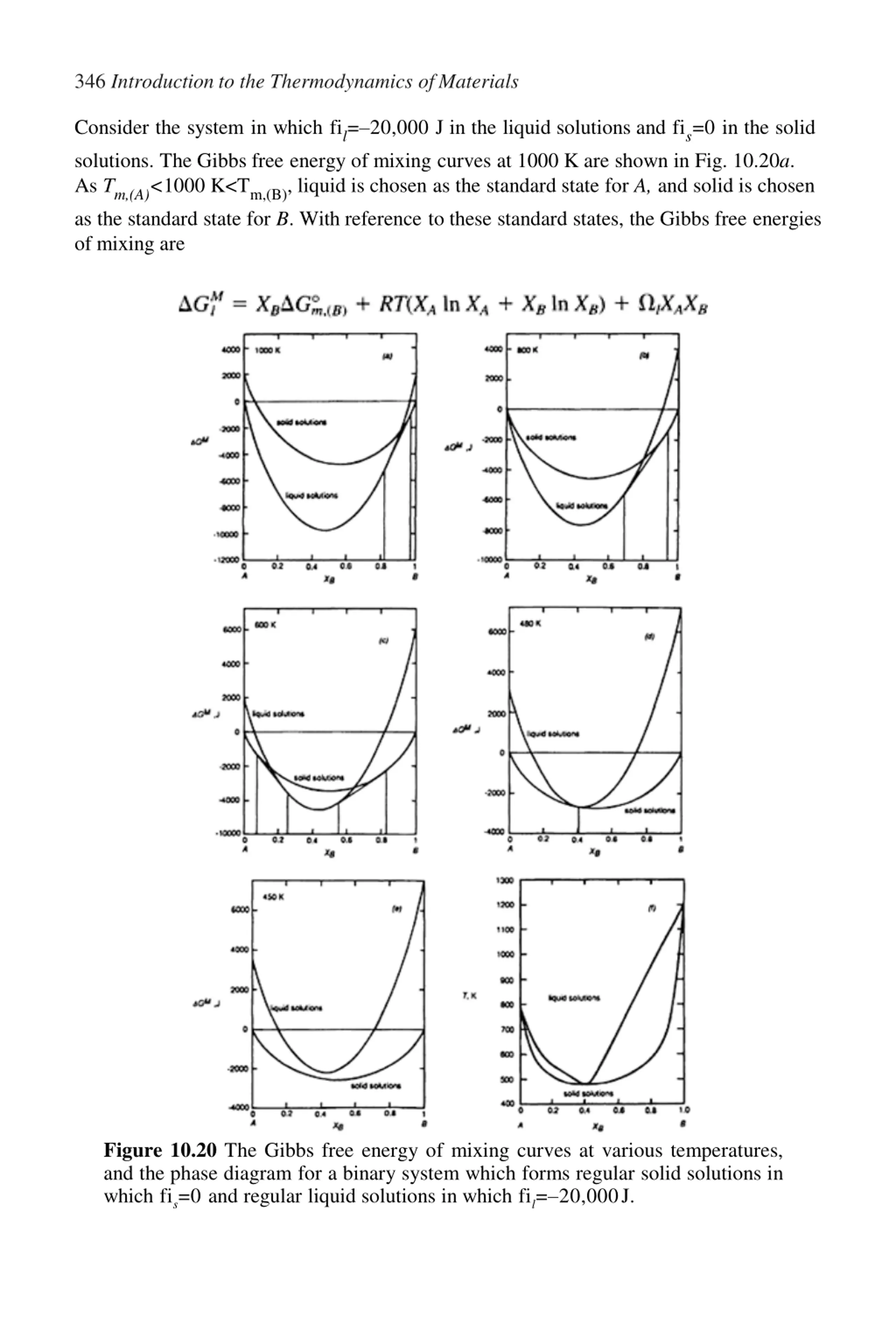 Gibbs Free Energy Composition and Phase Diagrams of Binary Systems 347 for the liquid solutions and for the solid solutions. Inserting the numerical datagives and The double tangent to the curves in Fig. 10.20a gives the liquidus composition of XB=0.82 and the solidus composition of XB=0.97. Decreasing the temperature causes the Gibbs free energies of the liquids to increase relative to those of the solids. As shown in Fig. 10.20b, the Gibbs free energies of pure solid A and pure liquid B are equal at the melting temperature of A, and the double tangent gives liquidus and solidus compositions of XB=0.69 and XB=0.94, respectively. At temperatures lower than Tm, (A)and Tm, (B)solid is chosen as the standard state for both components and the Gibbs free energies of mixing are written as and The curves at 600 K, shown in Fig. 10.20c, contain two double tangents and, as the temperature is further decreased, the curve for the liquids is raised relative to the curve for the solids until, at 480 K, the two double tangents collapse to a single point of contact between the curves at XB=0.41. At temperatures less than 480 K the curve for the liquids lies above that for the solids, and thus solid solutions are stable over the entire range of composition. The variations, with temperature, of the compositions of the double tangents give the phase diagram shown in Fig. 10.20f.