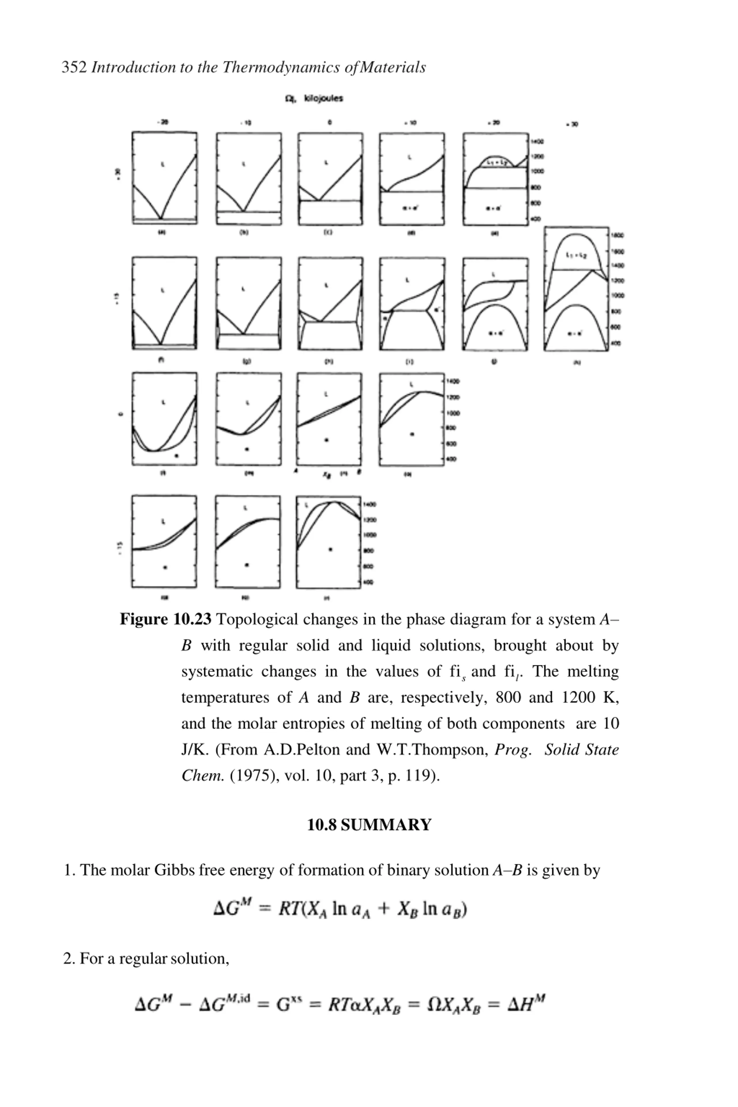 352 Introduction to the Thermodynamics ofMaterials Figure 10.23 Topological changes in the phase diagram for a system A B with regular solid and liquid solutions, brought about by systematic changes in the values of fisand fil. The melting temperatures of A and B are, respectively, 800 and 1200 K, and the molar entropies of melting of both components are 10 J/K. (From A.D.Pelton and W.T.Thompson, Prog. Solid State Chem. (1975), vol. 10, part 3, p. 119). 10.8 SUMMARY 1. The molar Gibbs free energy of formation of binary solution A B is given by 2. For a regularsolution,