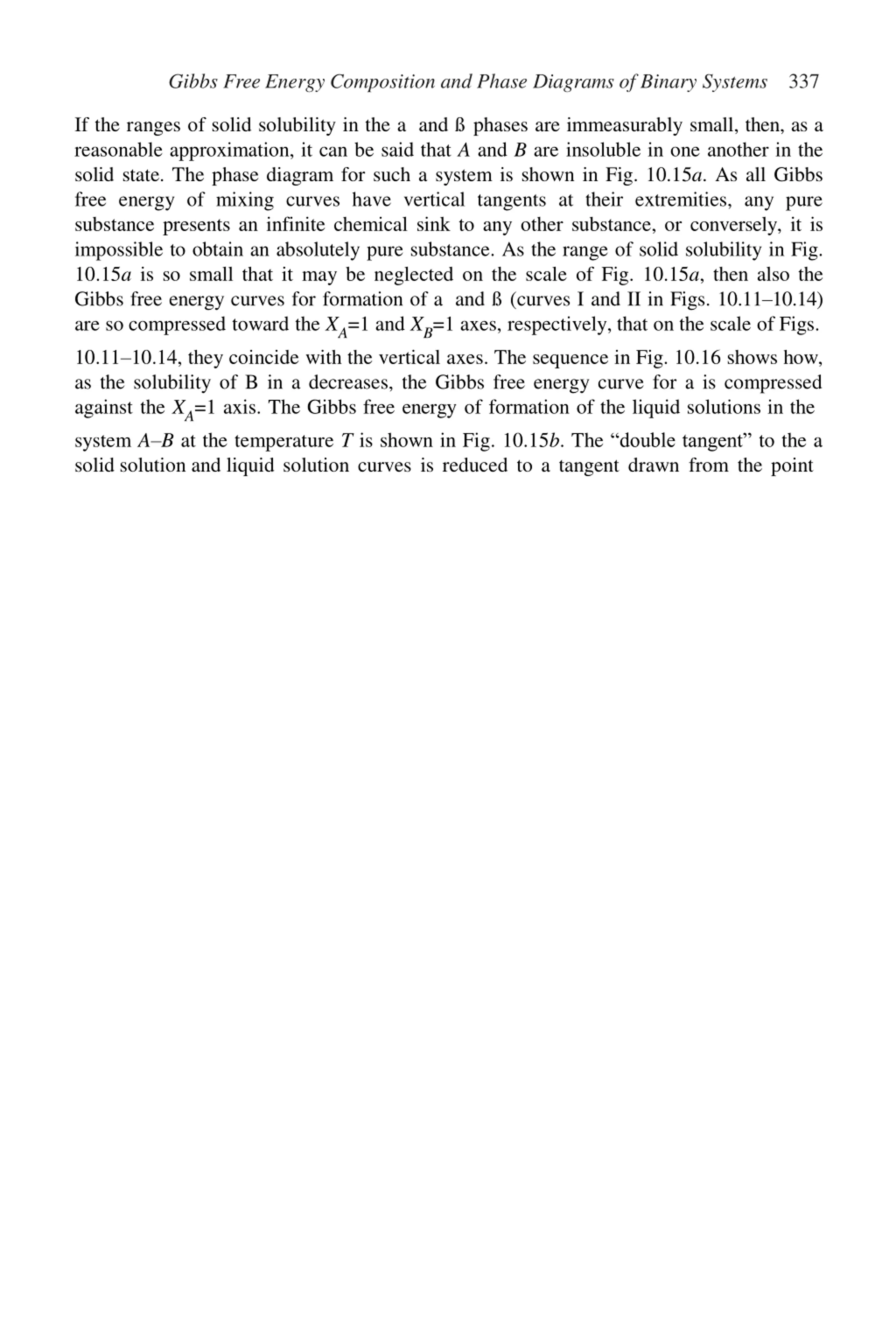 Gibbs Free Energy Composition and Phase Diagrams of Binary Systems 337 If the ranges of solid solubility in the a and phases are immeasurably small, then, as a reasonable approximation, it can be said that A and B are insoluble in one another in the solid state. The phase diagram for such a system is shown in Fig. 10.15a. As all Gibbs free energy of mixing curves have vertical tangents at their extremities, any pure substance presents an infinite chemical sink to any other substance, or conversely, it is impossible to obtain an absolutely pure substance. As the range of solid solubility in Fig. 10.15a is so small that it may be neglected on the scale of Fig. 10.15a, then also the Gibbs free energy curves for formation of a and (curves I and II in Figs. 10.11 10.14) are so compressed toward the XA=1 and XB=1 axes, respectively, that on the scale of Figs. 10.11 10.14, they coincide with the vertical axes. The sequence in Fig. 10.16 shows how, as the solubility of B in a decreases, the Gibbs free energy curve for a is compressed against the XA=1 axis. The Gibbs free energy of formation of the liquid solutions in the system A B at the temperature T is shown in Fig. 10.15b. The double tangent to the a solid solution and liquid solution curves is reduced to a tangent drawn from the point