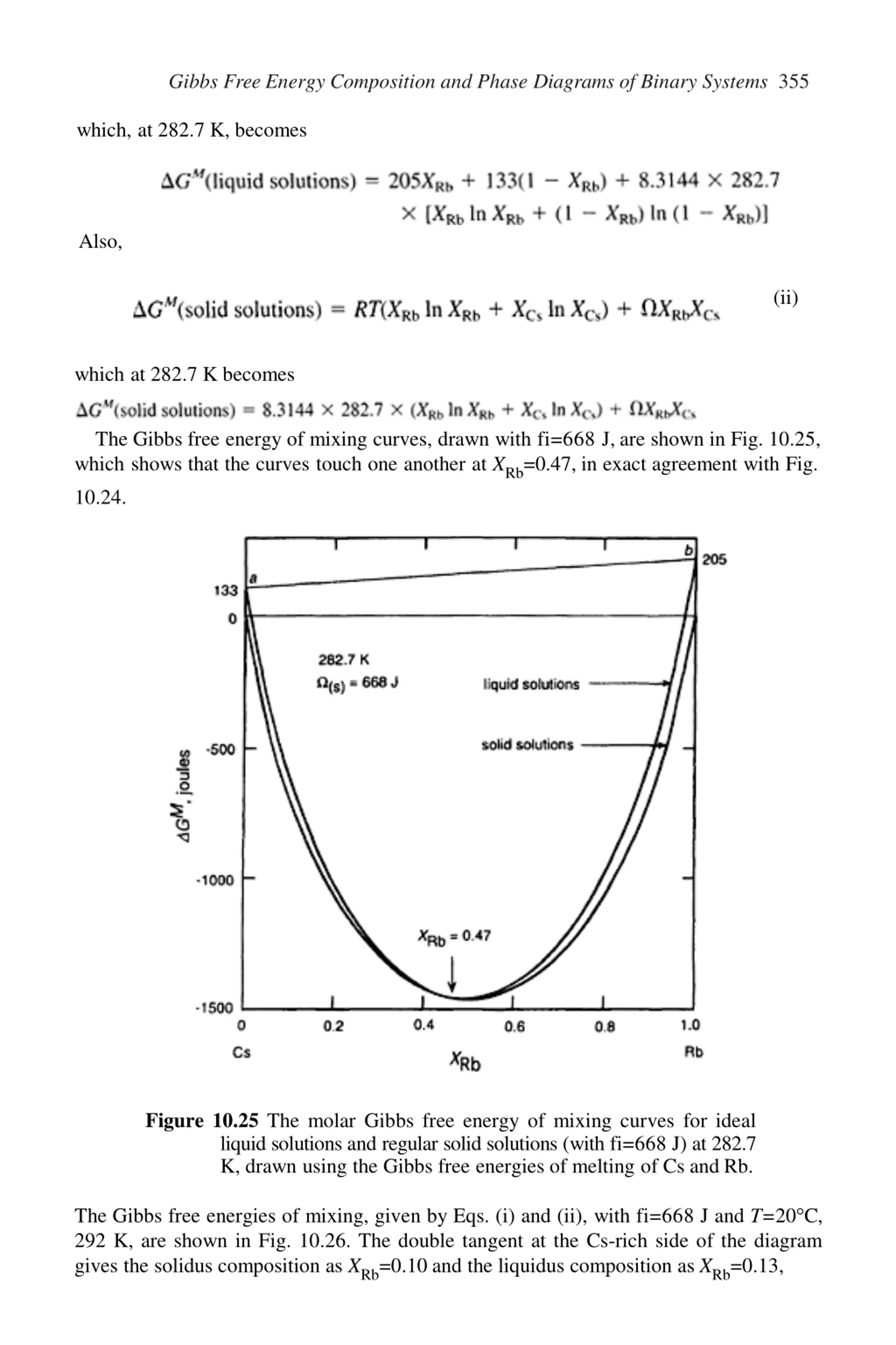 Gibbs Free Energy Composition and Phase Diagrams of Binary Systems 355 which, at 282.7 K, becomes Also, (ii) which at 282.7 K becomes The Gibbs free energy of mixing curves, drawn with fi=668 J, are shown in Fig. 10.25, which shows that the curves touch one another at XRb=0.47, in exact agreement with Fig. 10.24. Figure 10.25 The molar Gibbs free energy of mixing curves for ideal liquid solutions and regular solid solutions (with fi=668 J) at 282.7 K, drawn using the Gibbs free energies of melting of Cs and Rb. The Gibbs free energies of mixing, given by Eqs. (i) and (ii), with fi=668 J and T=20 C, 292 K, are shown in Fig. 10.26. The double tangent at the Cs-rich side of the diagram gives the solidus composition as XRb=0.10 and the liquidus composition as XRb=0.13,