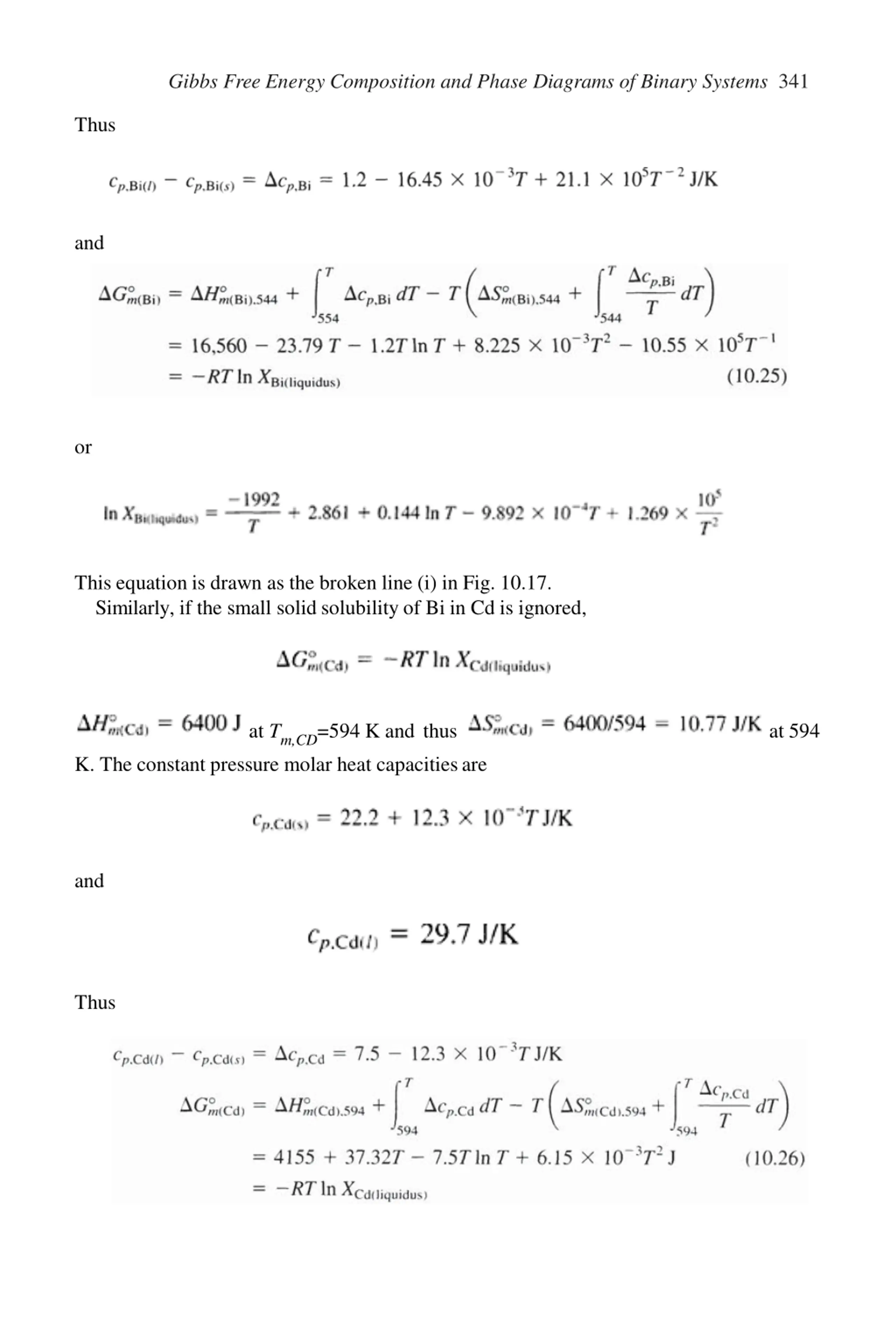 Gibbs Free Energy Composition and Phase Diagrams of Binary Systems 341 Thus and or This equation is drawn as the broken line (i) in Fig. 10.17. Similarly, if the small solid solubility of Bi in Cd is ignored, at Tm,CD=594 K and thus at 594 K. The constant pressure molar heat capacitiesare and Thus