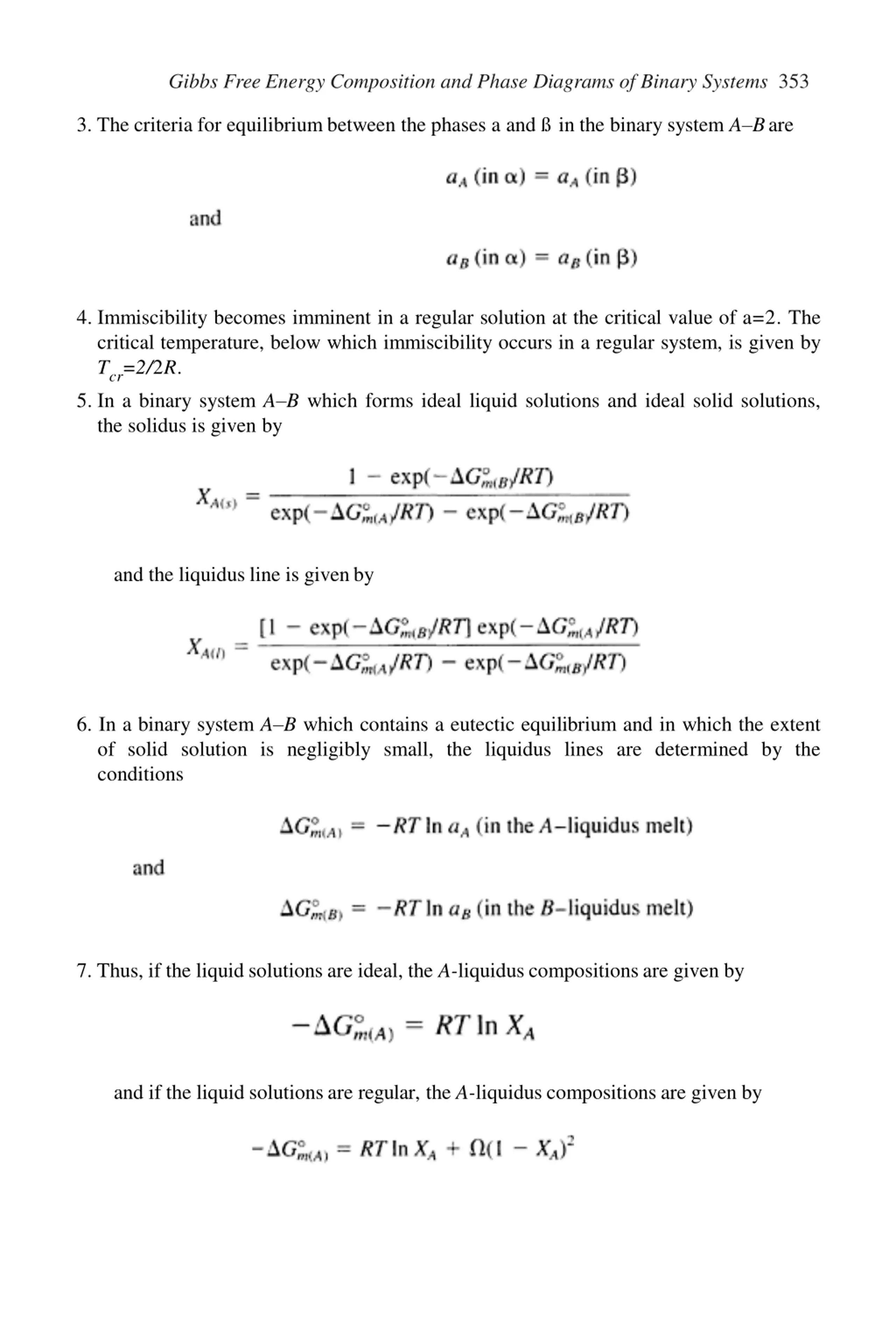 Gibbs Free Energy Composition and Phase Diagrams of Binary Systems 353 3. The criteria for equilibrium between the phases a and in the binary system A Bare 4. Immiscibility becomes imminent in a regular solution at the critical value of a=2. The critical temperature, below which immiscibility occurs in a regular system, is given by Tcr=2/2R. 5. In a binary system A B which forms ideal liquid solutions and ideal solid solutions, the solidus is given by and the liquidus line is givenby 6. In a binary system A B which contains a eutectic equilibrium and in which the extent of solid solution is negligibly small, the liquidus lines are determined by the conditions 7. Thus, if the liquid solutions are ideal, the A-liquidus compositions are given by and if the liquid solutions are regular, the A-liquidus compositions are given by