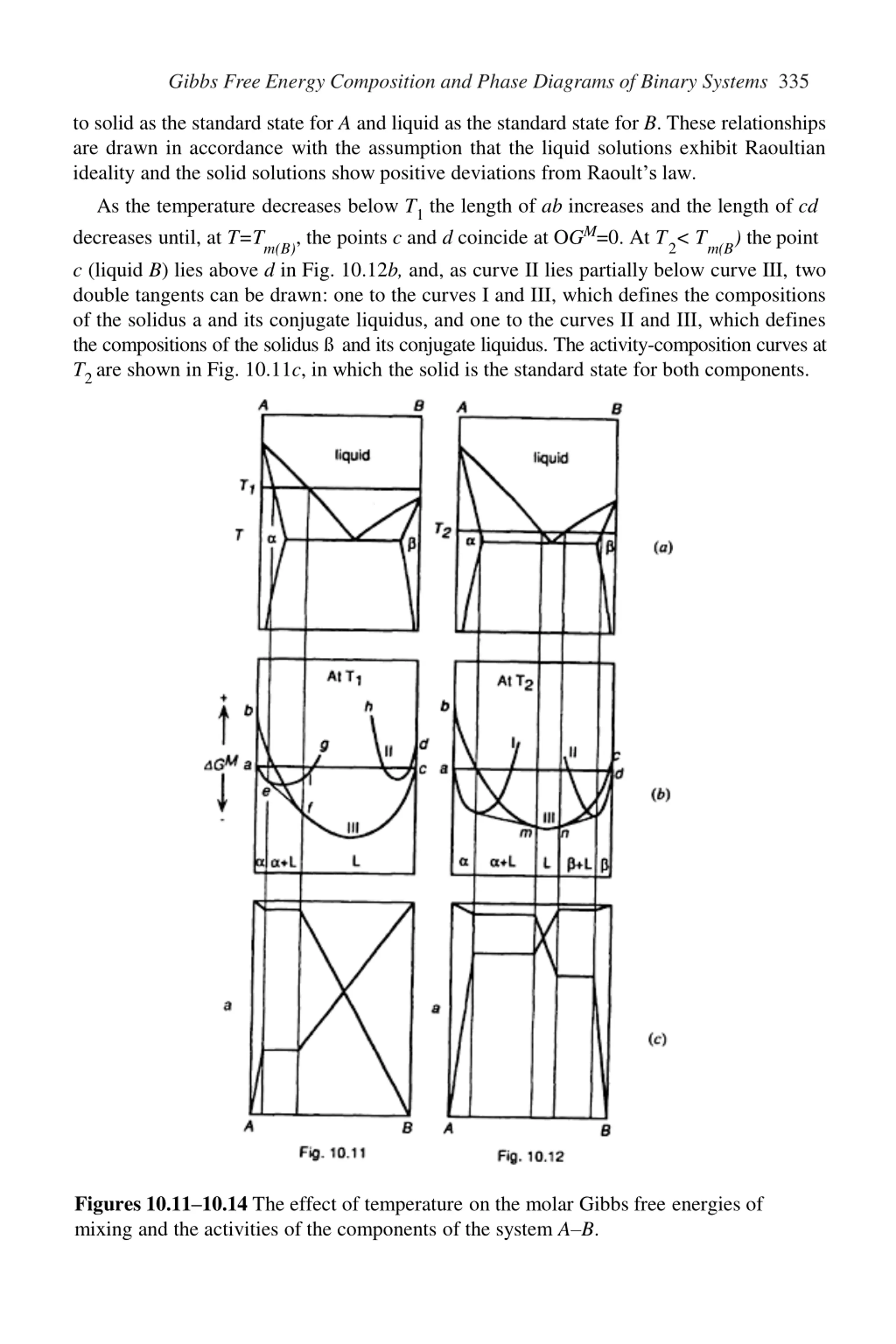 Gibbs Free Energy Composition and Phase Diagrams of Binary Systems 335 to solid as the standard state for A and liquid as the standard state for B. These relationships are drawn in accordance with the assumption that the liquid solutions exhibit Raoultian ideality and the solid solutions show positive deviations from Raoult s law. As the temperature decreases below T1the length of ab increases and the length of cd decreases until, at T=T , the points c and d coincide at OGM=0. At T < T c (liquid B) lies above d in Fig. 10.12b, and, as curve II lies partially below curve III, two double tangents can be drawn: one to the curves I and III, which defines the compositions of the solidus a and its conjugate liquidus, and one to the curves II and III, which defines the compositions of the solidus and its conjugate liquidus. The activity-composition curves at T2are shown in Fig. 10.11c, in which the solid is the standard state for both components. ) the point 2 m(B) m(B Figures 10.11 10.14 The effect of temperature on the molar Gibbs free energies of mixing and the activities of the components of the system A B.