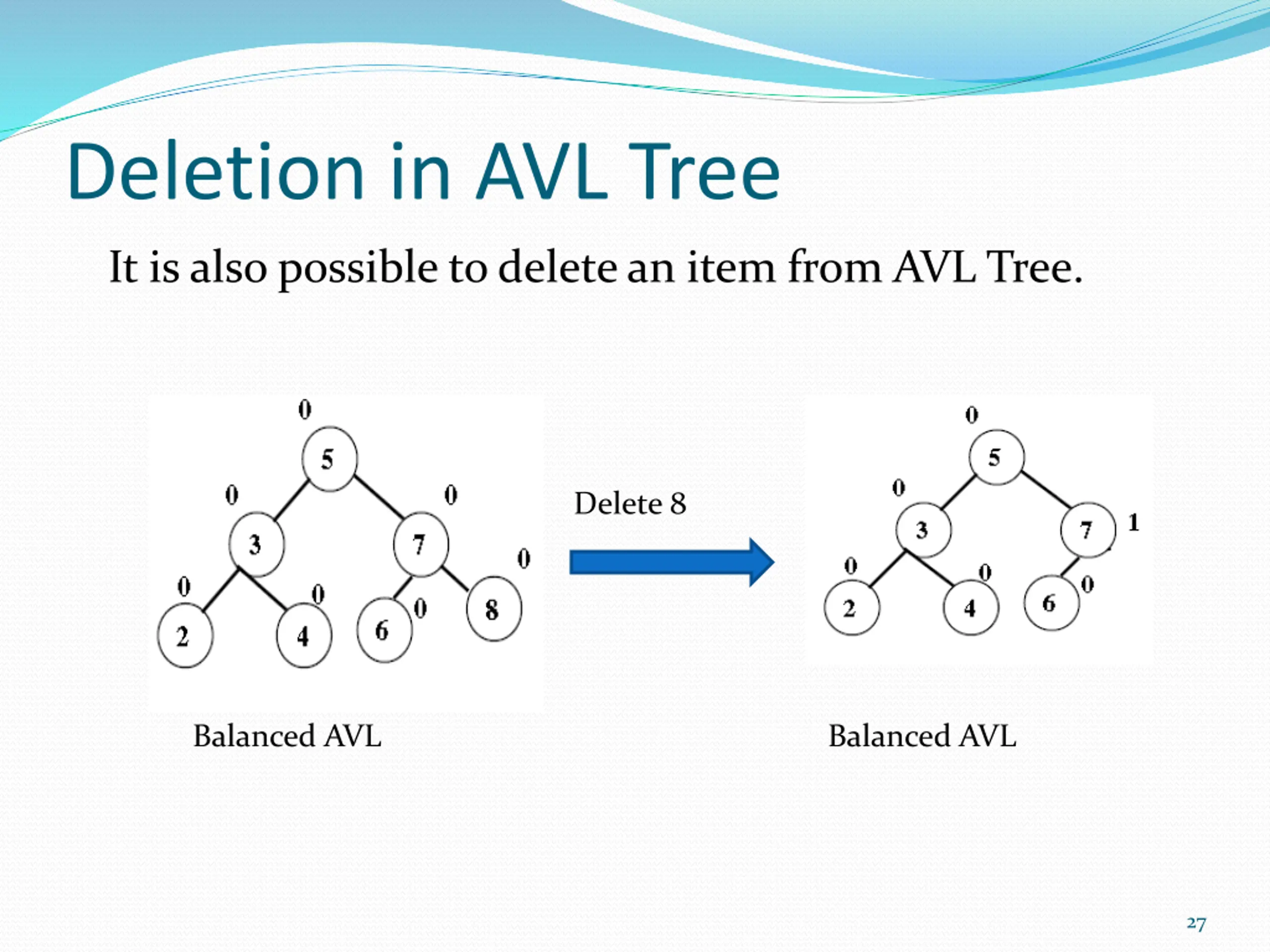 Deletion in AVL Tree It is also possible to delete an item from AVL Tree. Delete 8 Balanced AVL Balanced AVL 27