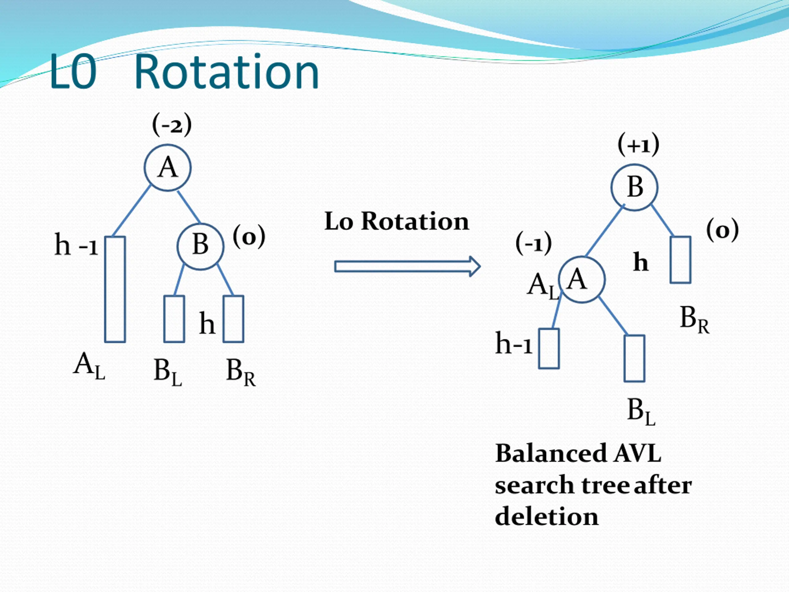 L0 Rotation (-1) A (-2) A Delete X (0) (0) B h-1 B h AL h h x AL BL BR BL BR Unbalanced AVL search treeafter deletion