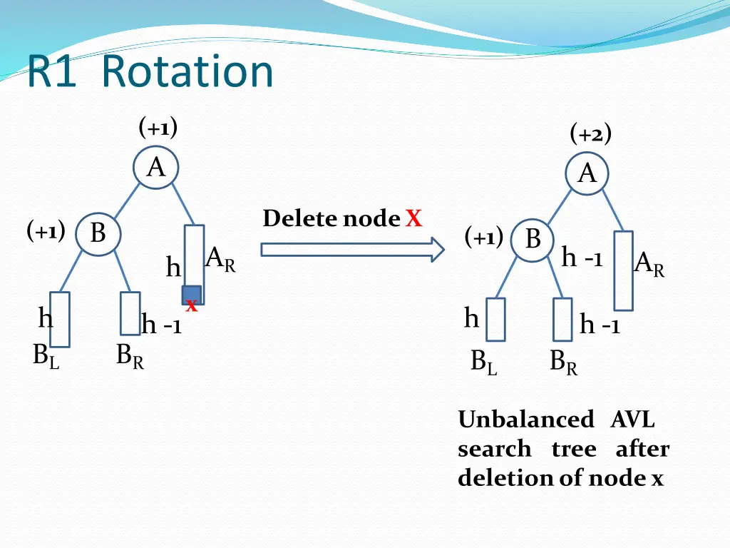 R1 Rotation (+1) A (+2) A Deletenode X (+1) B (+1) B hAR x h -1 AR h BL h BL h-1 h-1 BR BR Unbalanced AVL search tree after deletionof nodex