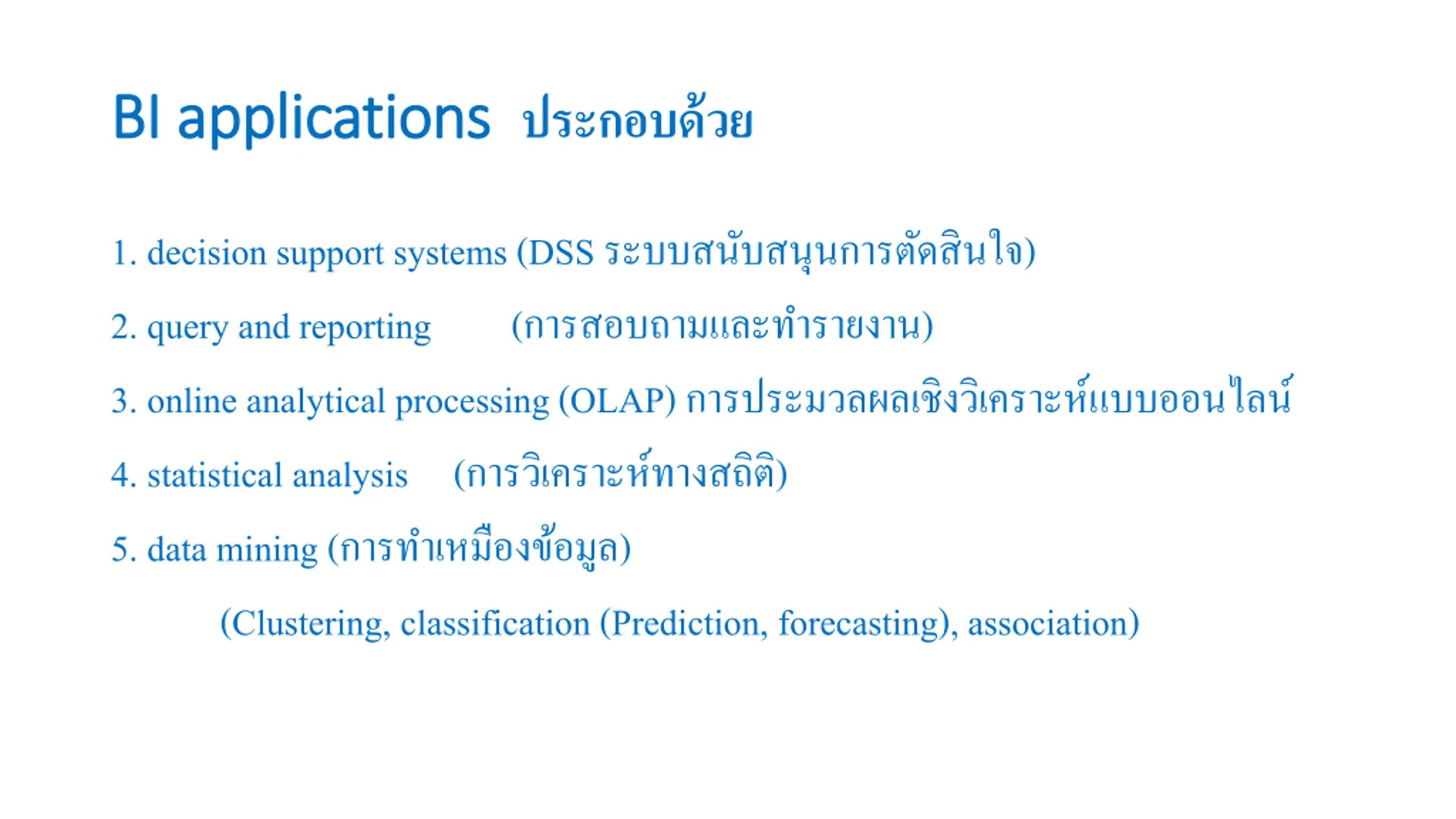 BI applications BI applications 1. decision support systems (DSS ) 2. query and reporting ( ) 3.online analytical processing (OLAP) 4.statistical analysis ( ) 5.data mining ( ) (Clustering, classification (Prediction, forecasting), association)