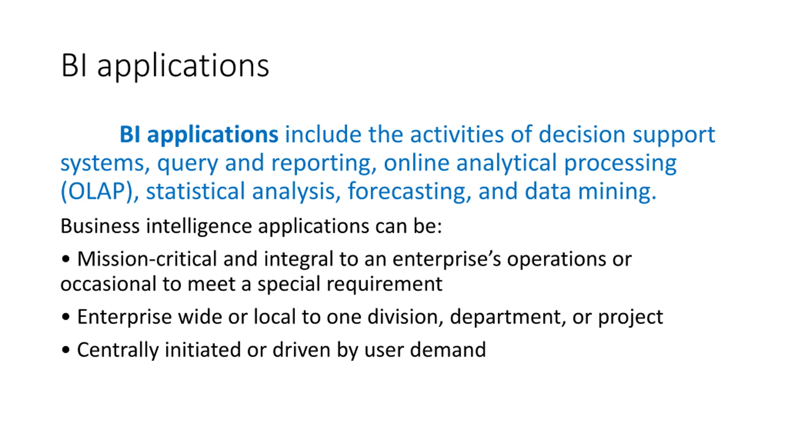 BI applications BI applications include the activities of decision support systems, query and reporting, online analytical processing (OLAP), statistical analysis, forecasting, and data mining. Business intelligence applications can be: Mission-critical and integral to an enterprise s operations or occasional to meet a special requirement Enterprise wide or local to one division, department, or project Centrally initiated or driven by user demand