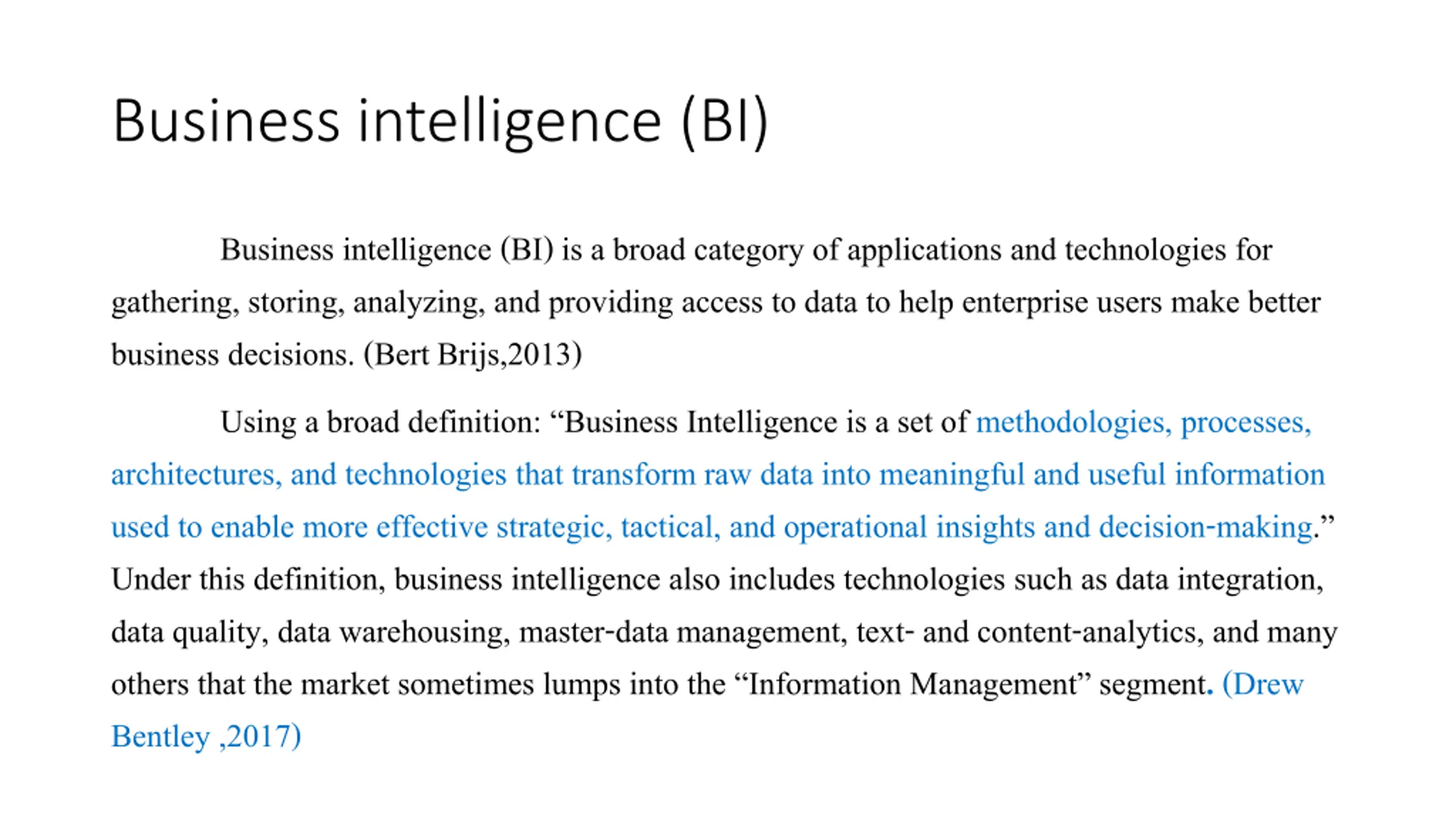 Business intelligence (BI) Business intelligence (BI) is a broad category of applications and technologies for gathering, storing, analyzing, and providing access to data to help enterprise users make better business decisions. (Bert Brijs,2013) Using a broad definition: Business Intelligence is a set of methodologies, processes, architectures, and technologies that transform raw data into meaningful and useful information used to enable more effective strategic, tactical, and operational insights and decision-making. Under this definition, business intelligence also includes technologies such as data integration, data quality, data warehousing, master-data management, text-and content-analytics, and many others that the market sometimes lumps into the Information Management segment. (Drew Bentley ,2017)