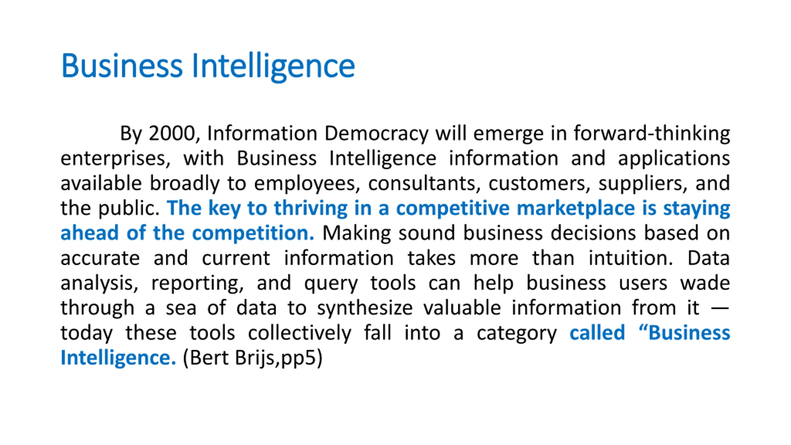 Business Intelligence Business Intelligence By 2000, Information Democracy will emerge in forward-thinking enterprises, with Business Intelligence information and applications available broadly to employees, consultants, customers, suppliers, and the public. The key to thriving in a competitive marketplace is staying ahead of the competition. Making sound business decisions based on accurate and current information takes more than intuition. Data analysis, reporting, and query tools can help business users wade through a sea of data to synthesize valuable information from it today these tools collectively fall into a category called Business Intelligence. (Bert Brijs,pp5)