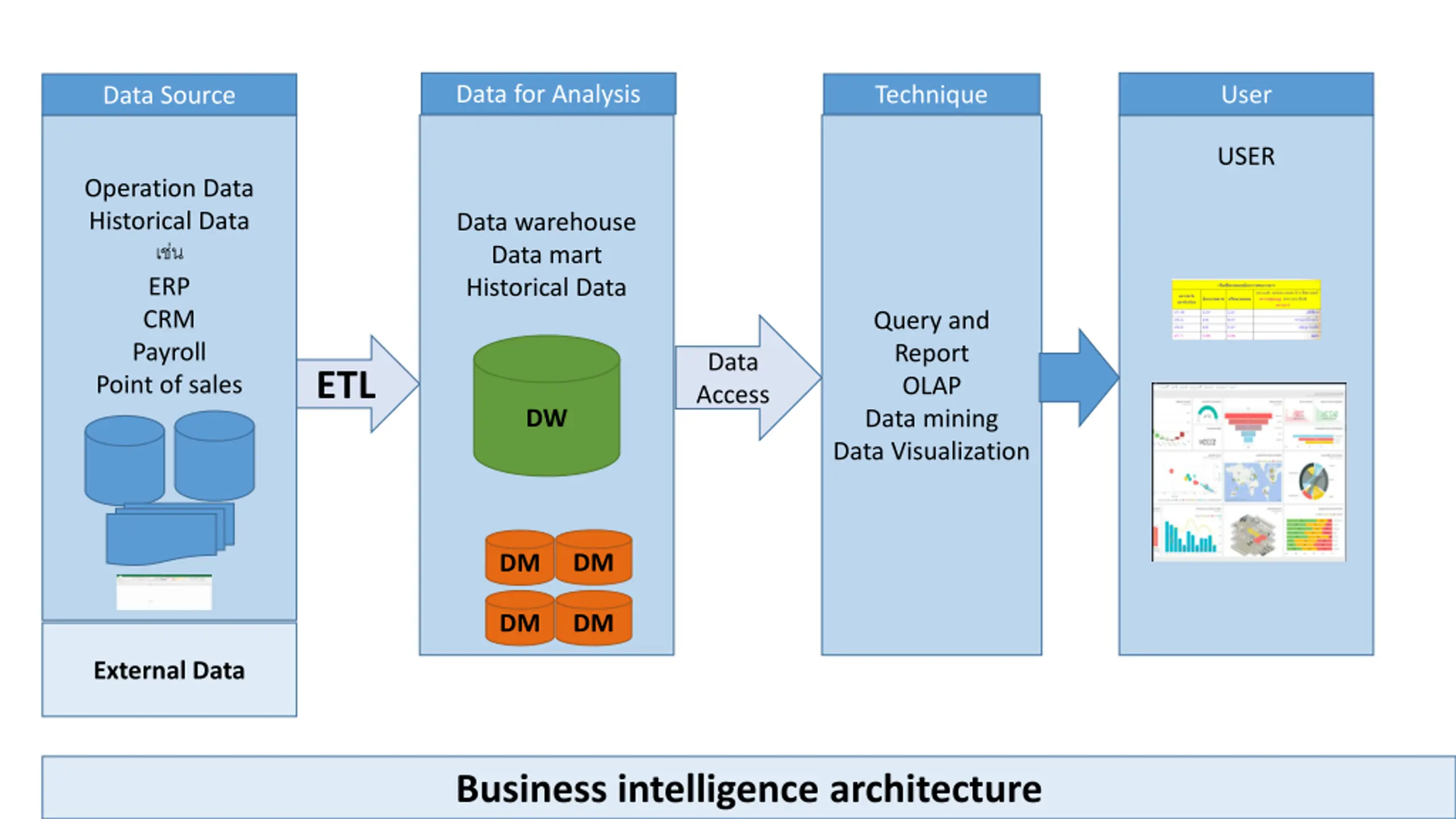 Data for Analysis Technique User Data Source USER Operation Data Historical Data ERP CRM Payroll Point of sales Data warehouse Data mart Historical Data Query and Report OLAP Data mining Data Visualization Data Access ETL DW DM DM DM DM External Data Business intelligence architecture