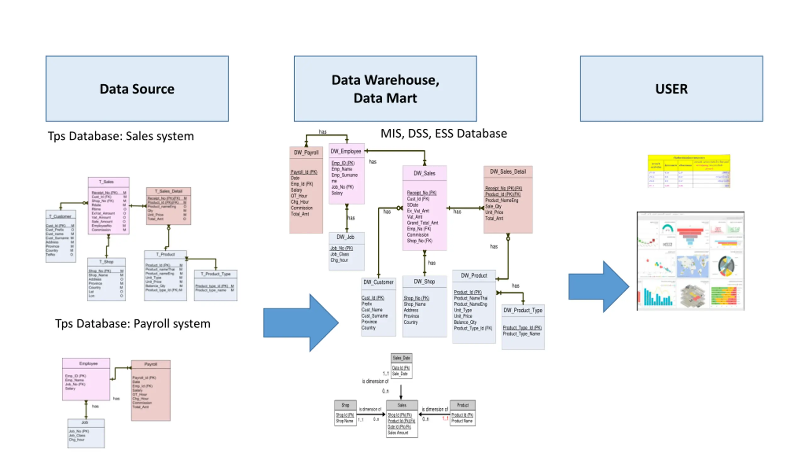 Data Warehouse, Data Mart Data Source USER MIS, DSS, ESS Database has Tps Database: Sales system DW_Employee DW_Payroll has Emp_ID (PK) Emp_Name Emp_Surname me Job_No (FK) Salary DW_Sales_Detail Payroll_Id (PK) Date Emp_Id (FK) Salary OT_Hour Chg_Hour Commission Total_Amt DW_Sales Receipt_No (PK)(FK) Product_Id (PK)(FK) Product_NameEng Sale_Qty Unit_Price Total_Amt Receipt_No (PK) Cust_Id (FK) SDate Ex_Vat_Amt Vat_Amt Grand_Total_Amt Emp_No (FK) Commission Shop_No (FK) has has has DW_Job has Job_No (PK) Job_Class Chg_hour has DW_Product DW_Shop DW_Customer has Product_Id (PK) Product_NameThai Product_NameEng Unit_Type Unit_Price Balance_Qty Product_Type_Id (FK) Cust_Id (PK) Prefix Cust_Name Cust_Surname Province Country Shop_No (PK) Shop_Name Address Province Country DW_Product_Type Tps Database: Payroll system Product_Type_Id (PK) Product_Type_Name Sales_Date Date Id (Pk) Sale_Date 1..1 is dimension of 0..n Shop Sales Product is dimension of is dimension of Shop Id (Pk) Shop Name Shop Id (Pk)(Fk) Product Id (Pk)(Fk) Date Id (Pk)(Fk) Sales Amount Product Id (Pk) Product Name 1..1 0..n 0..n 1..1