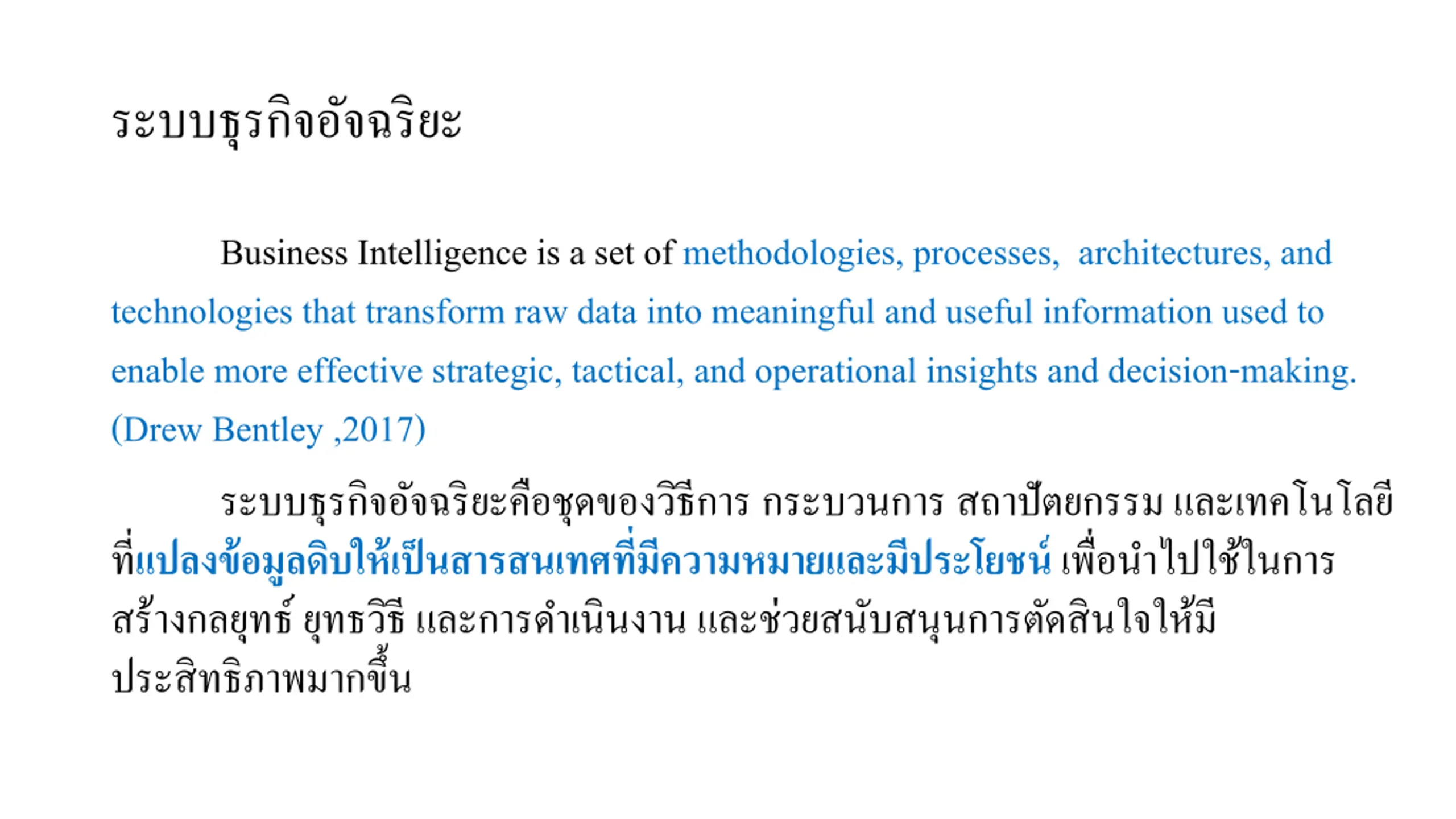 Business Intelligence is a set of methodologies, processes, architectures, and technologies that transform raw data into meaningful and useful information used to enable more effective strategic, tactical, and operational insights and decision-making. (Drew Bentley ,2017)