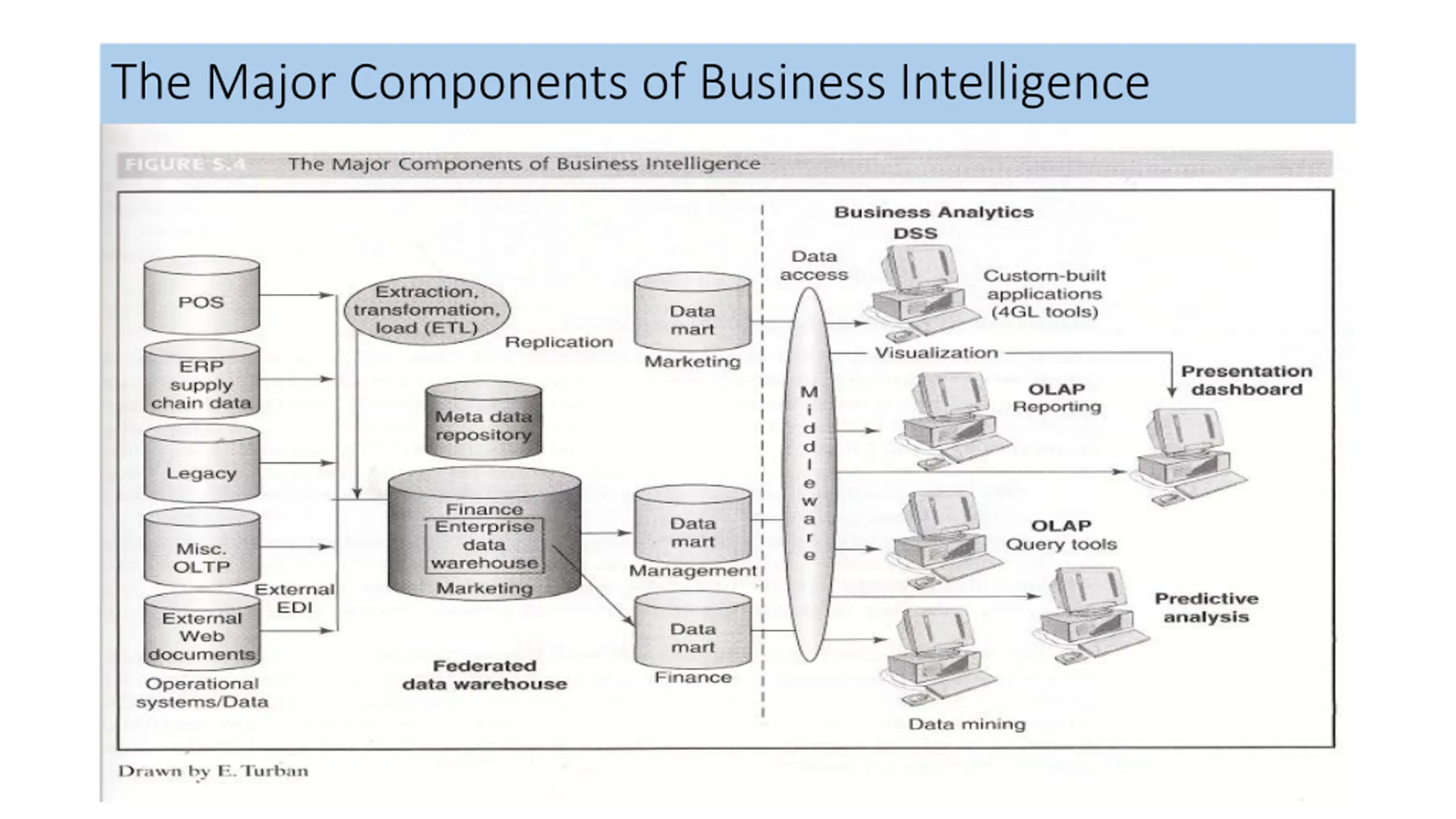 The different components of BI architecture https://enterprizeea.files.wordpress.com/2014/06/bi-business-intelligence-and-data-warehouse.png https://www.researchgate.net/figure/A-Typical-architecture-of-business-intelligence-and-data-sources-to-create-data-warehouse_fig2_281278975