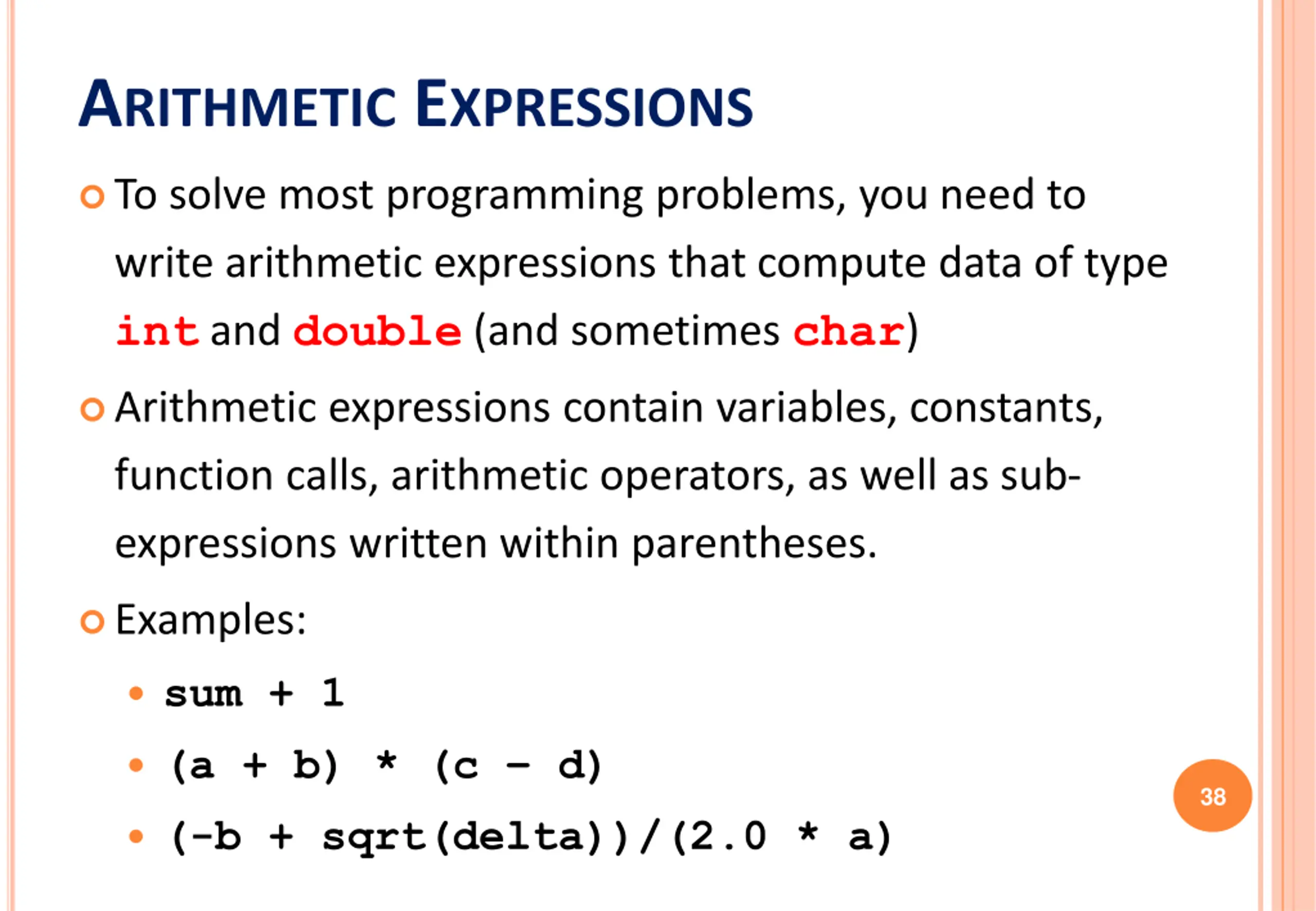 ARITHMETIC EXPRESSIONS To solve most programming problems, you need to write arithmetic expressions that compute data of type int and double (and sometimes char) Arithmetic expressions contain variables, constants, function calls, arithmetic operators, as well as sub- expressions written within parentheses. Examples: sum + 1 (a + b) * (c d) 38 (-b + sqrt(delta))/(2.0 * a)