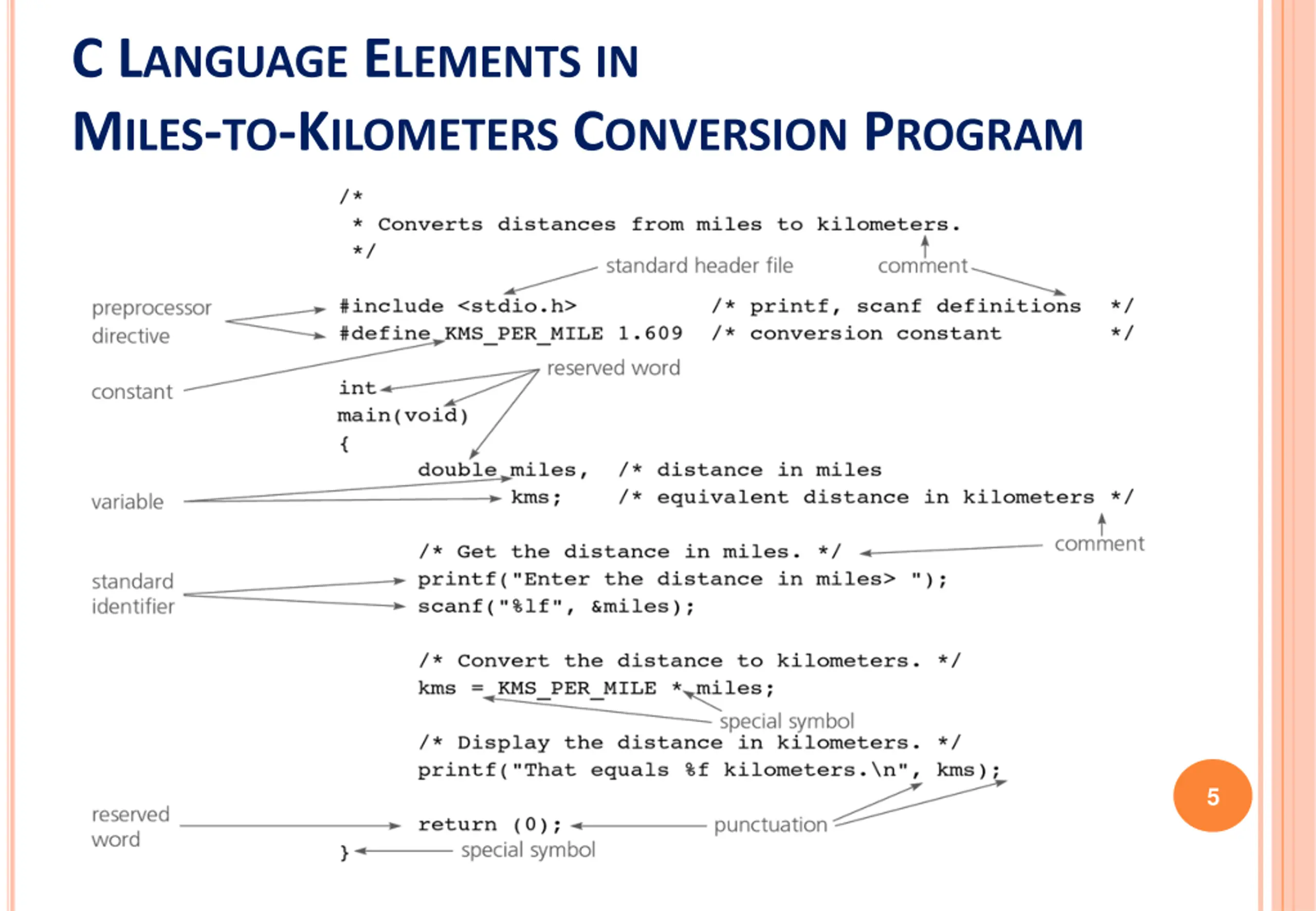C LANGUAGE ELEMENTSIN MILES-TO-KILOMETERS CONVERSION PROGRAM 5