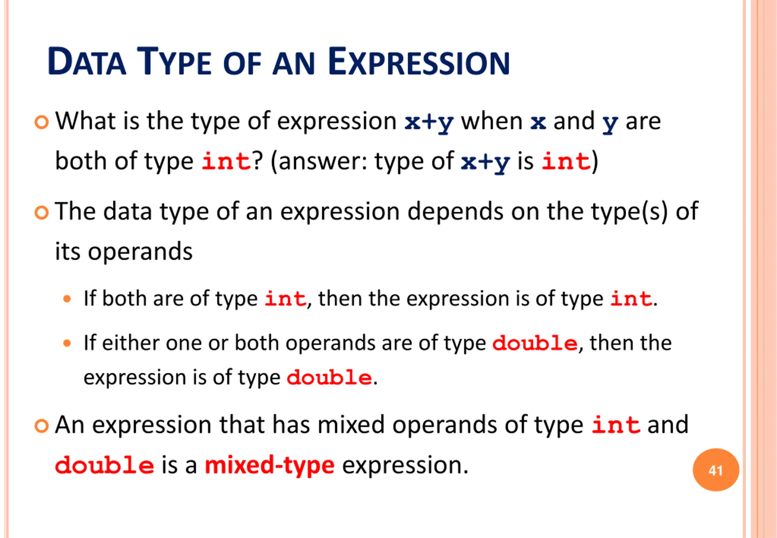 DATA TYPEOFAN EXPRESSION What is the type of expression x+y when x and y are both of type int? (answer: type of x+y is int) The data type of an expression depends on the type(s) of its operands If both are of type int, then the expression is of type int. If either one or both operands are of type double, then the expression is of type double. An expression that has mixed operands of type int and double is a mixed-type expression. 41
