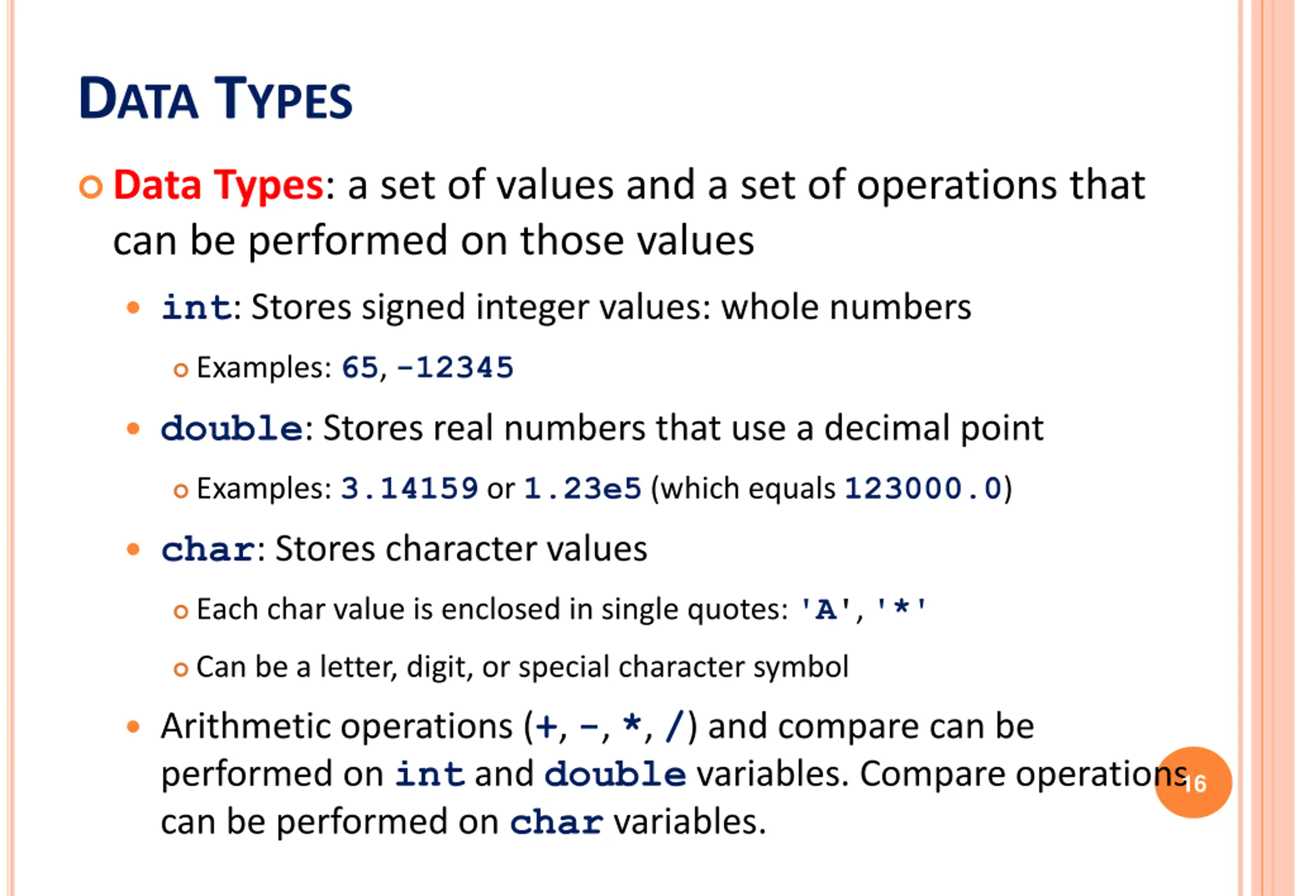 DATA TYPES Data Types: a set of values and a set of operations that can be performed on those values int: Stores signed integer values: whole numbers Examples: 65, -12345 double: Stores real numbers that use a decimal point Examples: 3.14159 or 1.23e5 (which equals 123000.0) char: Stores character values Each char value is enclosed in single quotes: 'A', '*' Can be a letter, digit, or special character symbol Arithmetic operations (+, -, *, /) and compare can be performed on int and double variables. Compare operations can be performed on char variables. 16