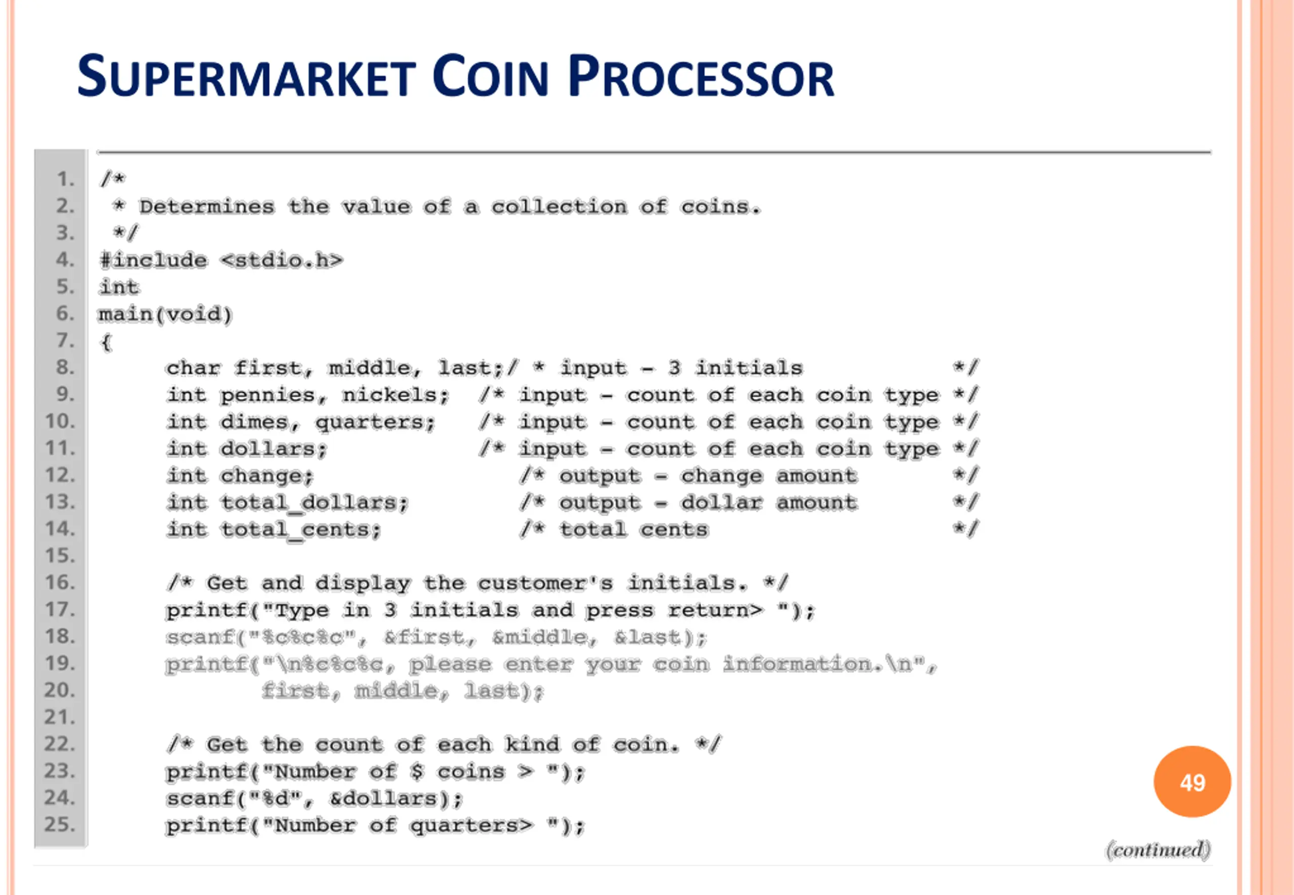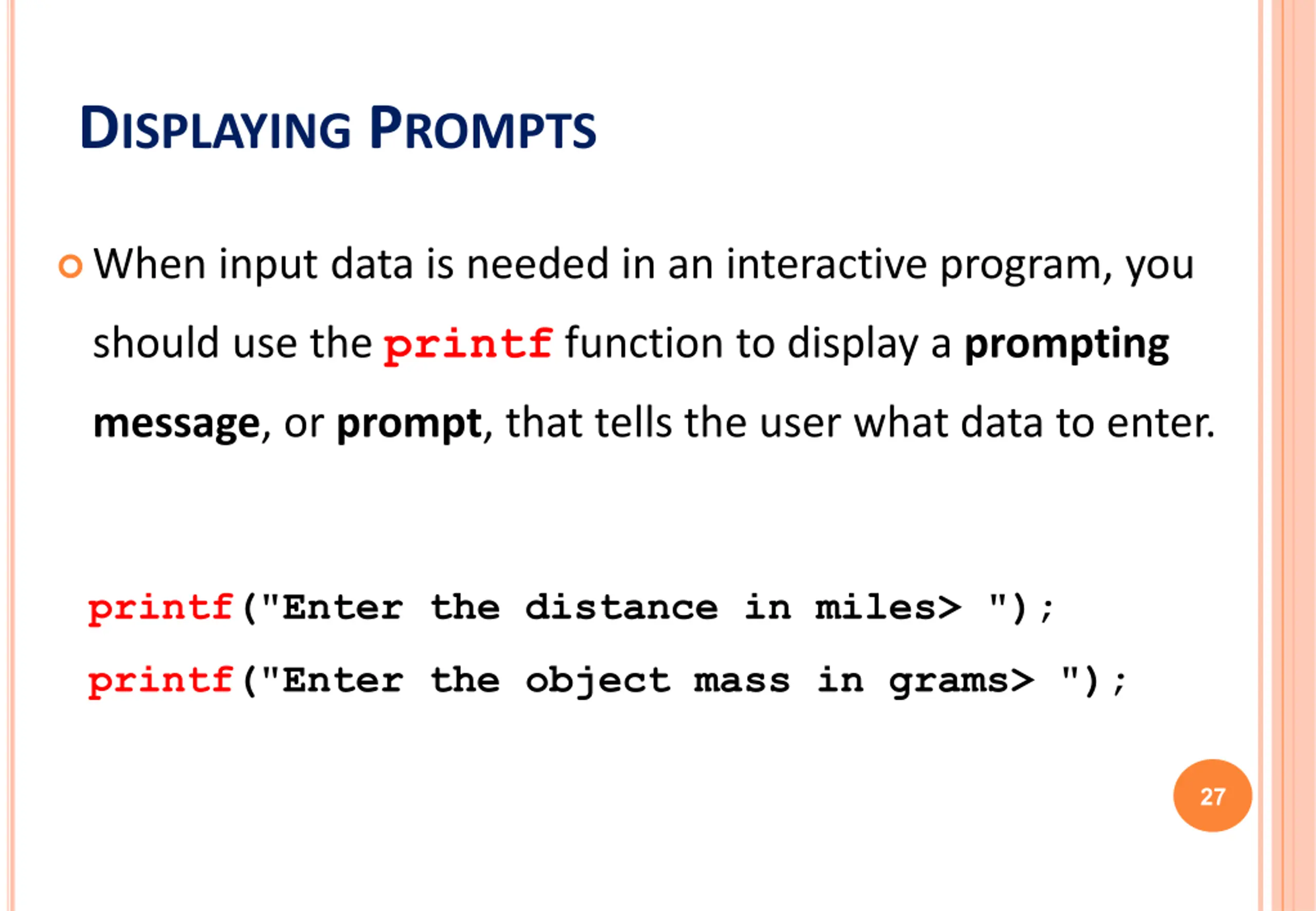 DISPLAYING PROMPTS When input data is needed in an interactive program, you should use the printf function to display a prompting message, or prompt, that tells the user what data to enter. printf("Enter the distance in miles> "); printf("Enter the object mass in grams> "); 27