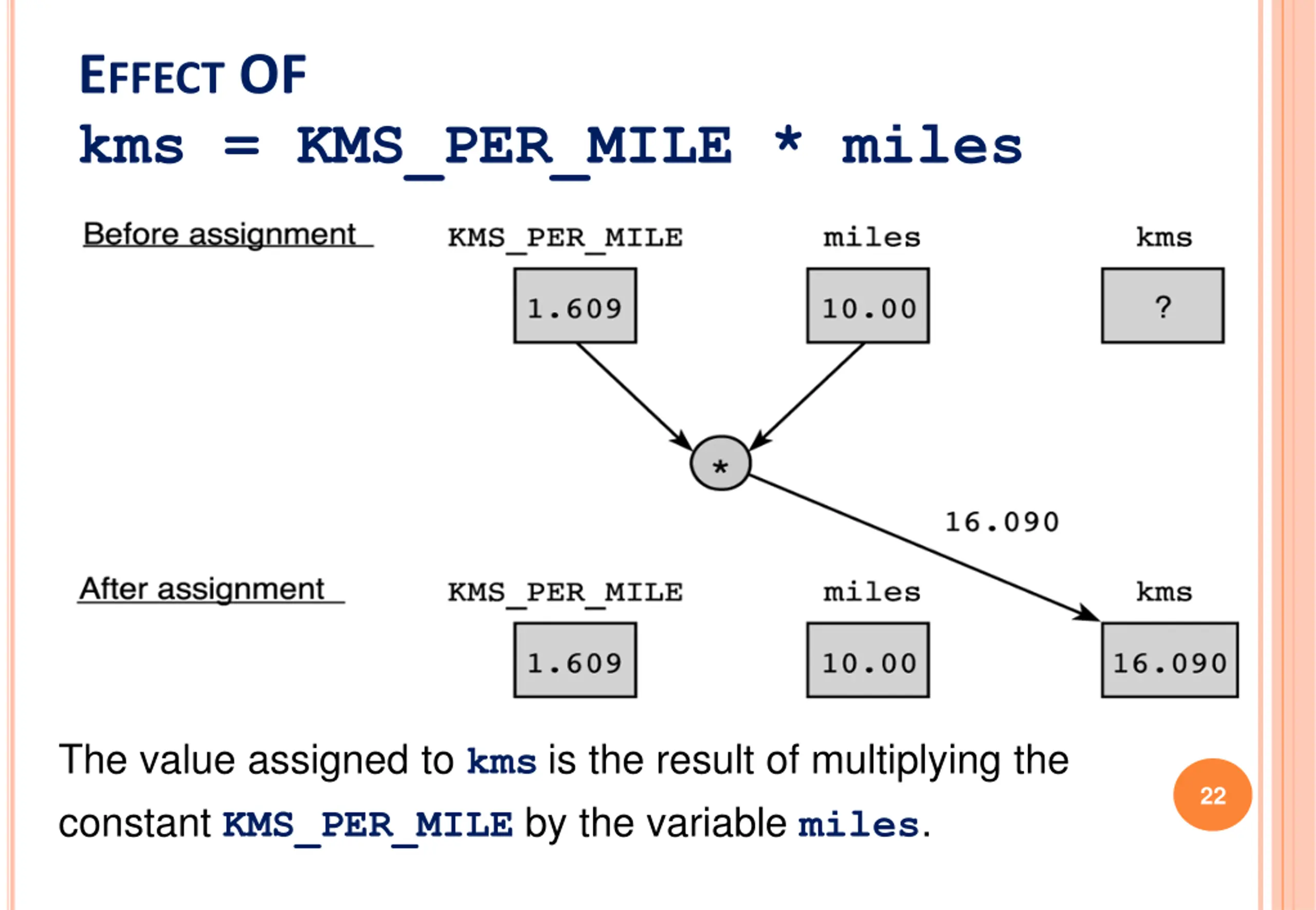 EFFECT OF kms = KMS_PER_MILE * miles The value assigned to kmsis the result of multiplying the constant KMS_PER_MILE by the variable miles. 22