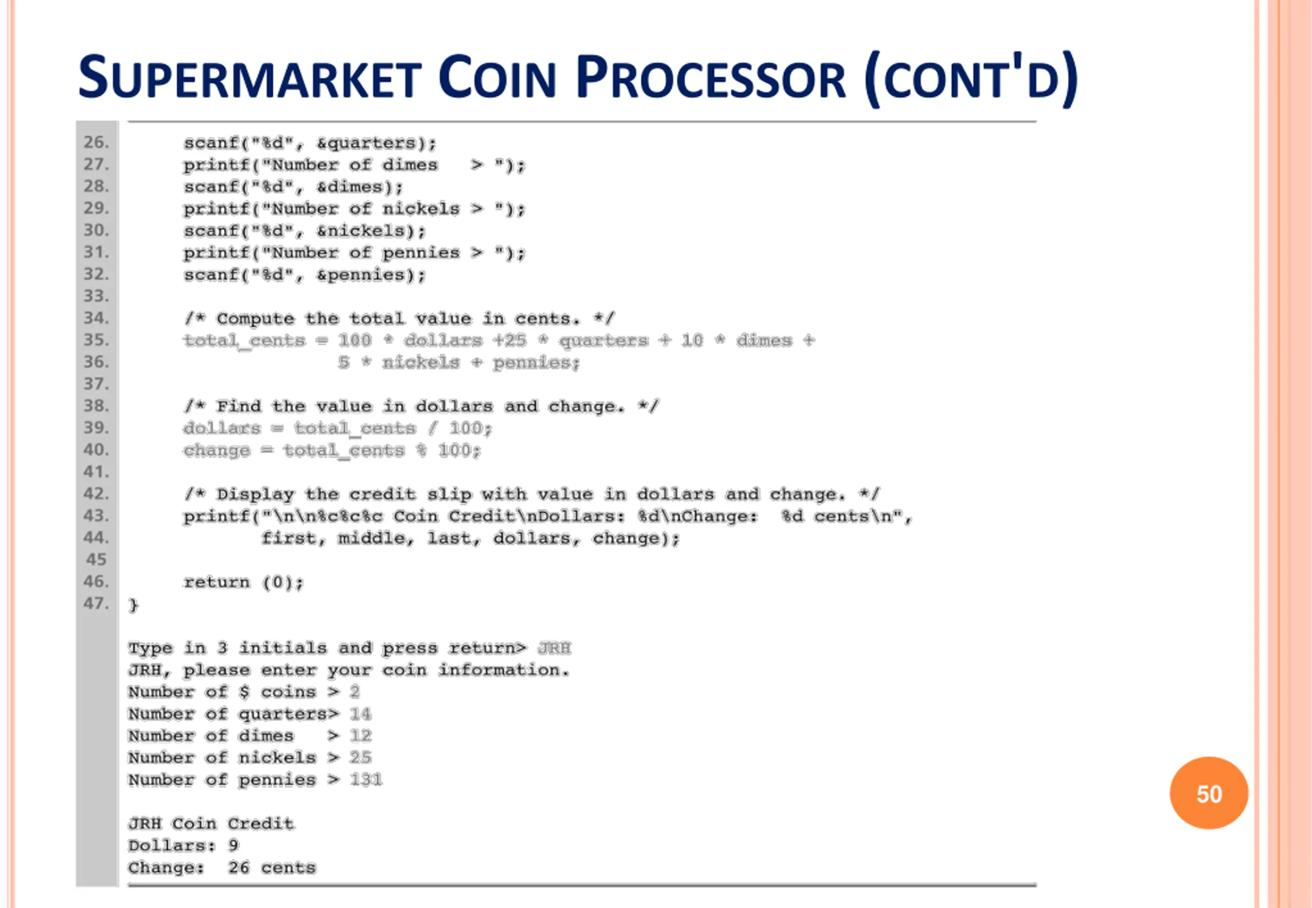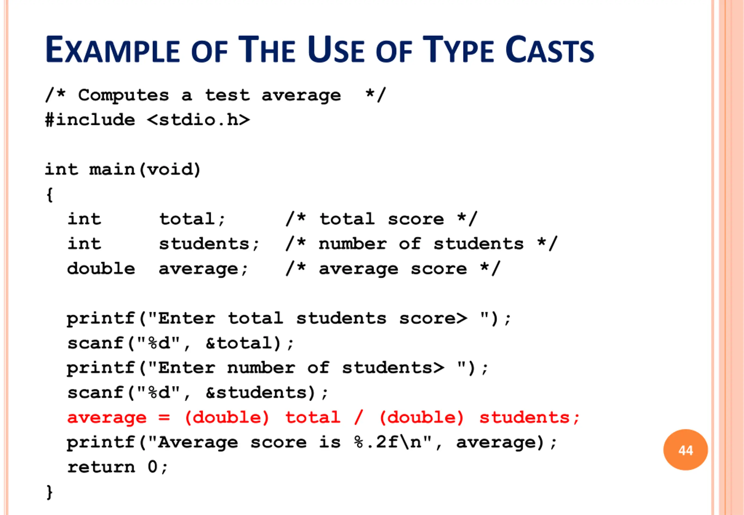 EXAMPLEOF THE USEOF TYPE CASTS /* Computes a test average */ #include <stdio.h> int main(void) { int total; /* total score */ int students; /* number of students */ double average; /* average score */ printf("Enter total students score> "); scanf("%d", &total); printf("Enter number of students> "); scanf("%d", &students); average = (double) total / (double) students; printf("Average score is %.2f\n", average); return 0; } 44