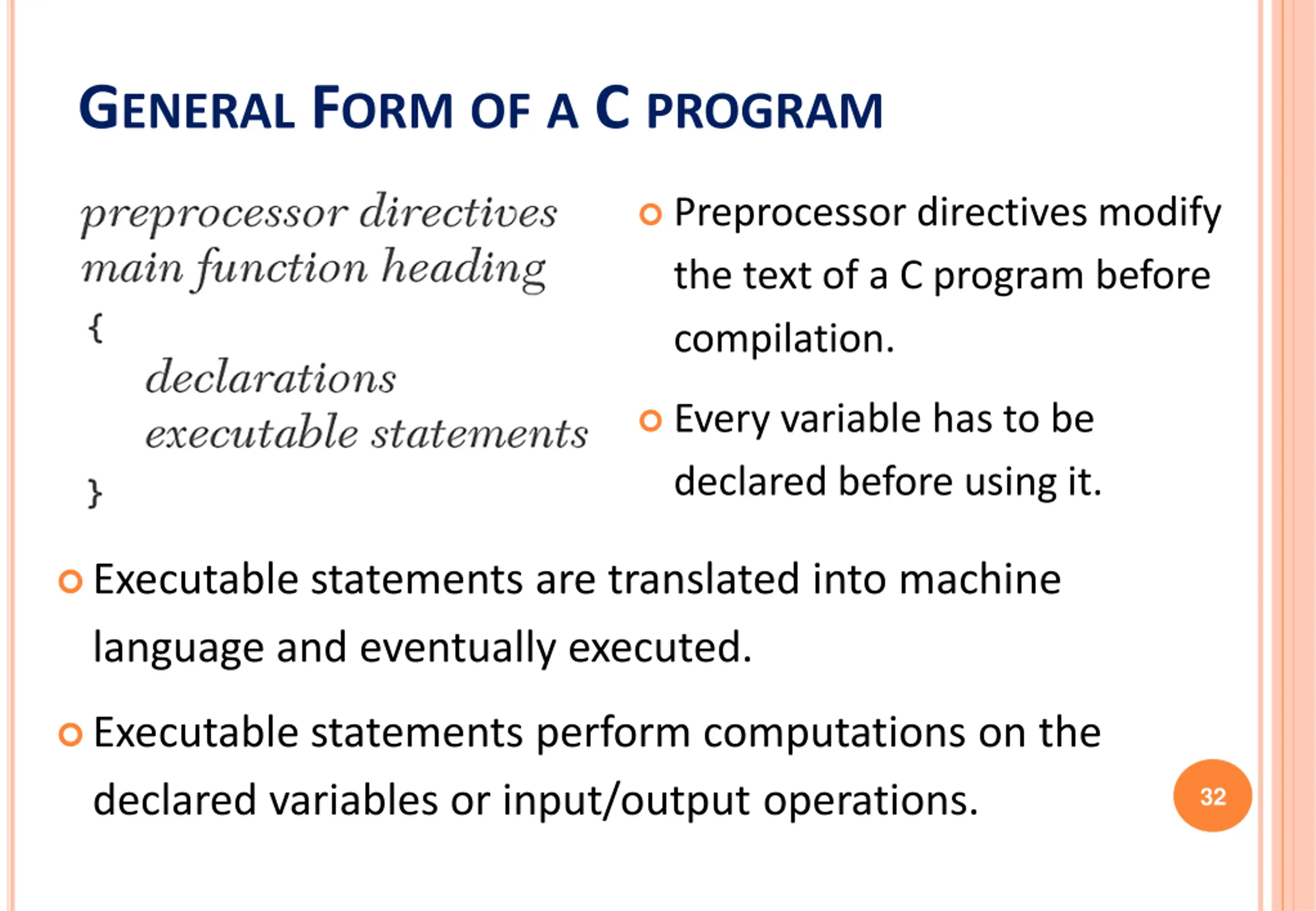 GENERAL FORMOFA C PROGRAM Preprocessor directives modify the text of a C program before compilation. Every variable has to be declared before using it. Executable statements are translated into machine language and eventually executed. Executable statements perform computations on the declared variables or input/output operations. 32