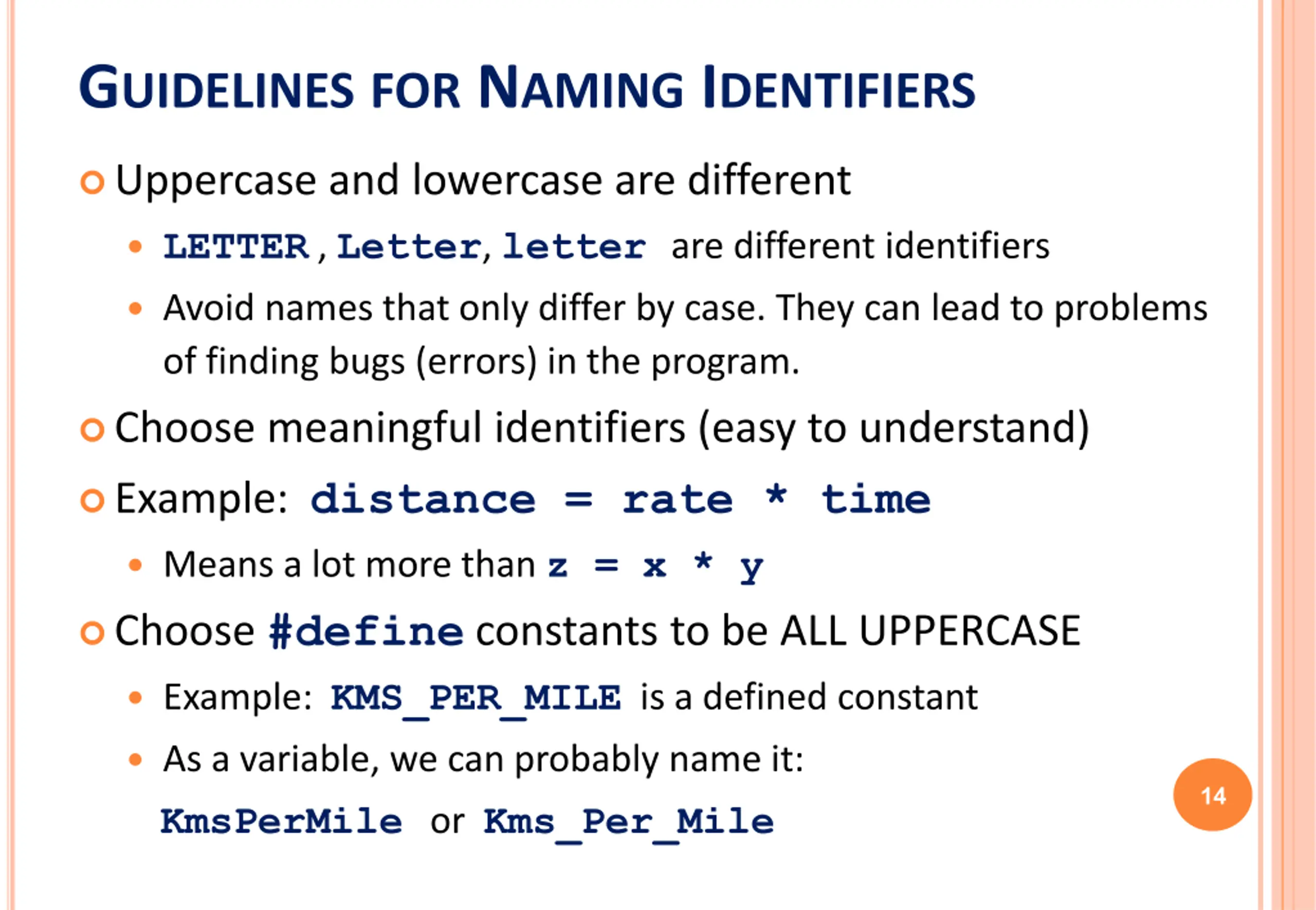 GUIDELINESFOR NAMING IDENTIFIERS Uppercase and lowercase are different LETTER , Letter, letterare different identifiers Avoid names that only differ by case. They can lead to problems of finding bugs (errors) in the program. Choose meaningful identifiers (easy to understand) Example: distance = rate * time Means a lot more than z = x * y Choose #define constants to be ALL UPPERCASE Example: KMS_PER_MILE is a defined constant As a variable, we can probably name it: KmsPerMile or Kms_Per_Mile 14