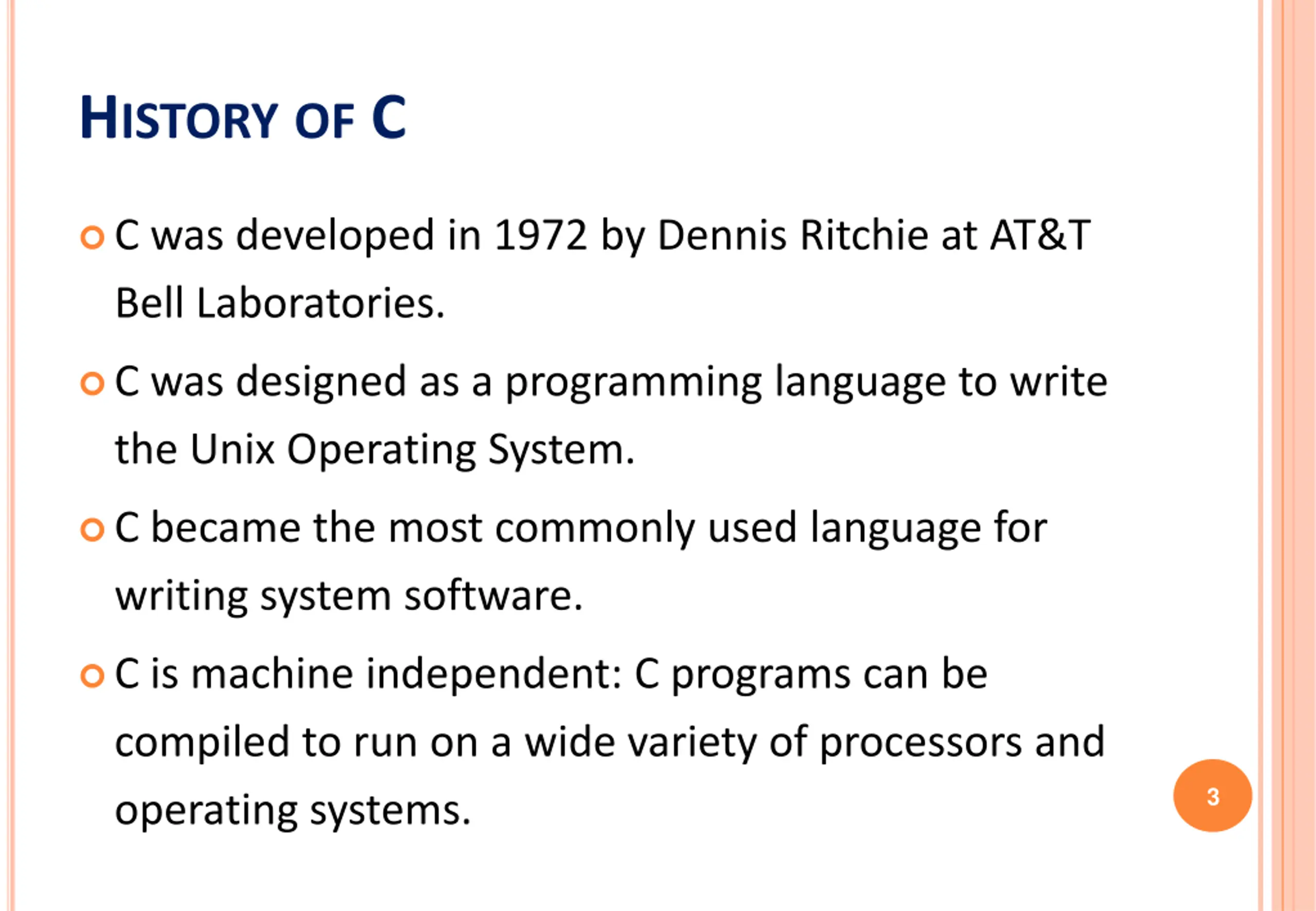 HISTORYOF C C was developed in 1972 by Dennis Ritchie at AT&T Bell Laboratories. C was designed as a programming language to write the Unix Operating System. C became the most commonly used language for writing system software. C is machine independent: C programs can be compiled to run on a wide variety of processors and operating systems. 3