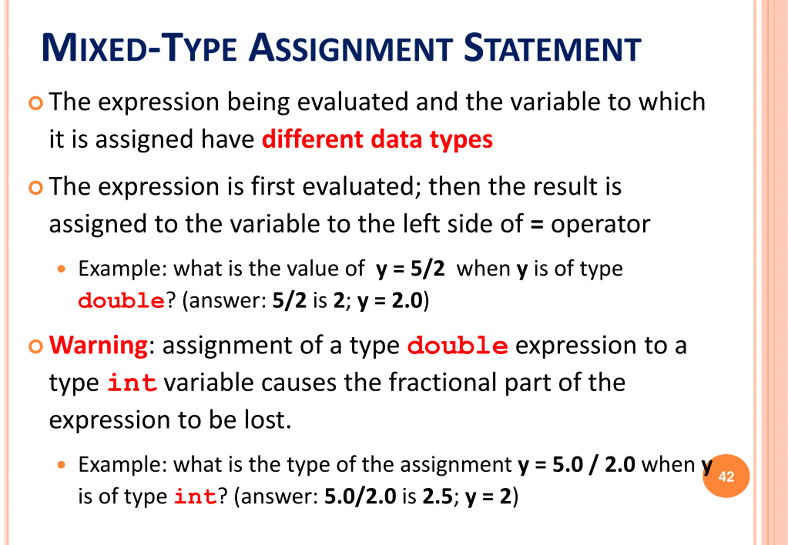 MIXED-TYPE ASSIGNMENT STATEMENT The expression being evaluated and the variable to which it is assigned have different data types The expression is first evaluated; then the result is assigned to the variable to the left side of = operator Example: what is the value of y = 5/2 when y is of type double? (answer: 5/2 is 2; y = 2.0) Warning: assignment of a type double expression to a type int variable causes the fractional part of the expression to be lost. Example: what is the type of the assignment y = 5.0 / 2.0 when y is of type int? (answer: 5.0/2.0 is 2.5; y = 2) 42
