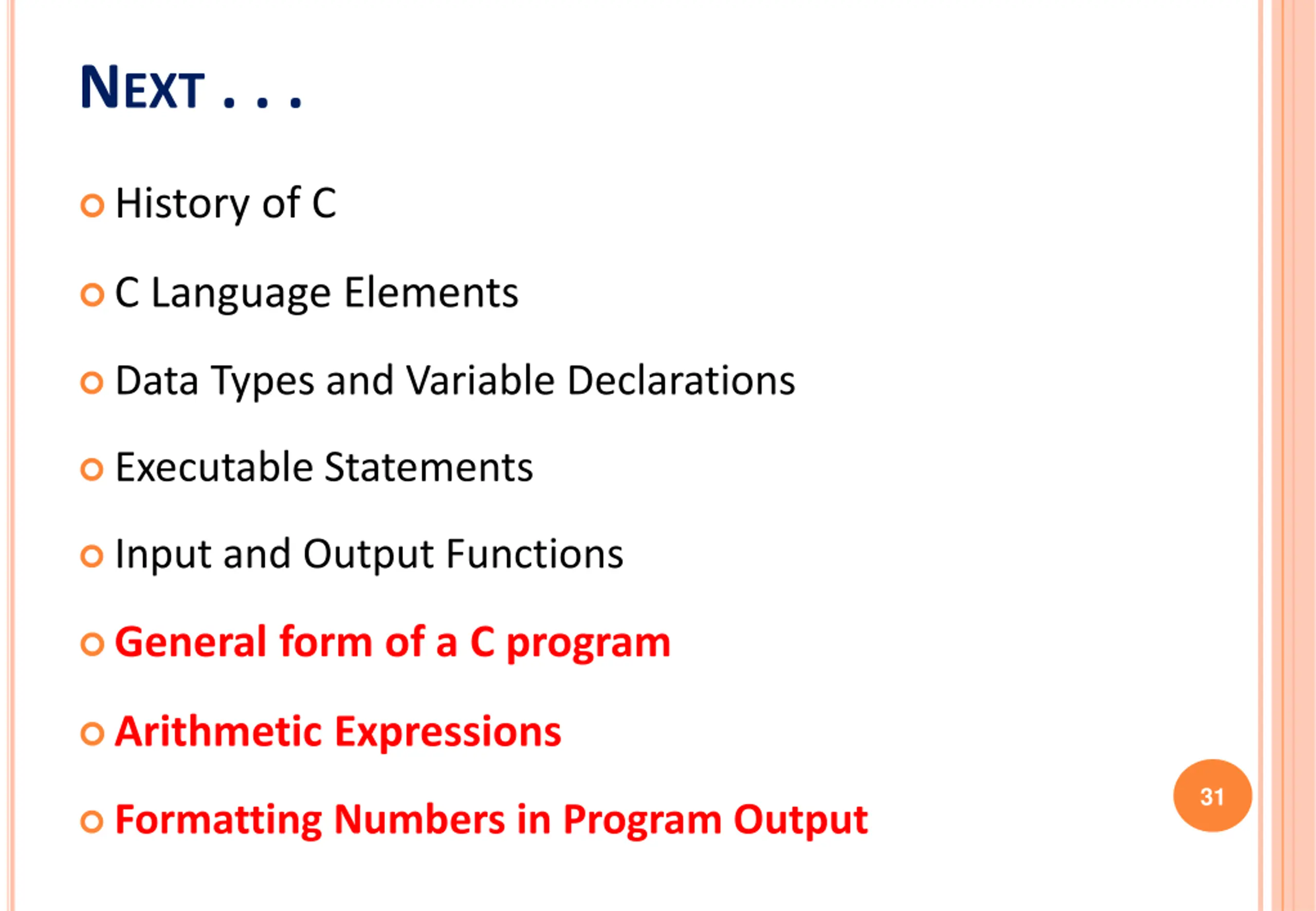 NEXT . . . History of C C Language Elements Data Types and Variable Declarations Executable Statements Input and Output Functions General form of a C program Arithmetic Expressions 31 Formatting Numbers in Program Output