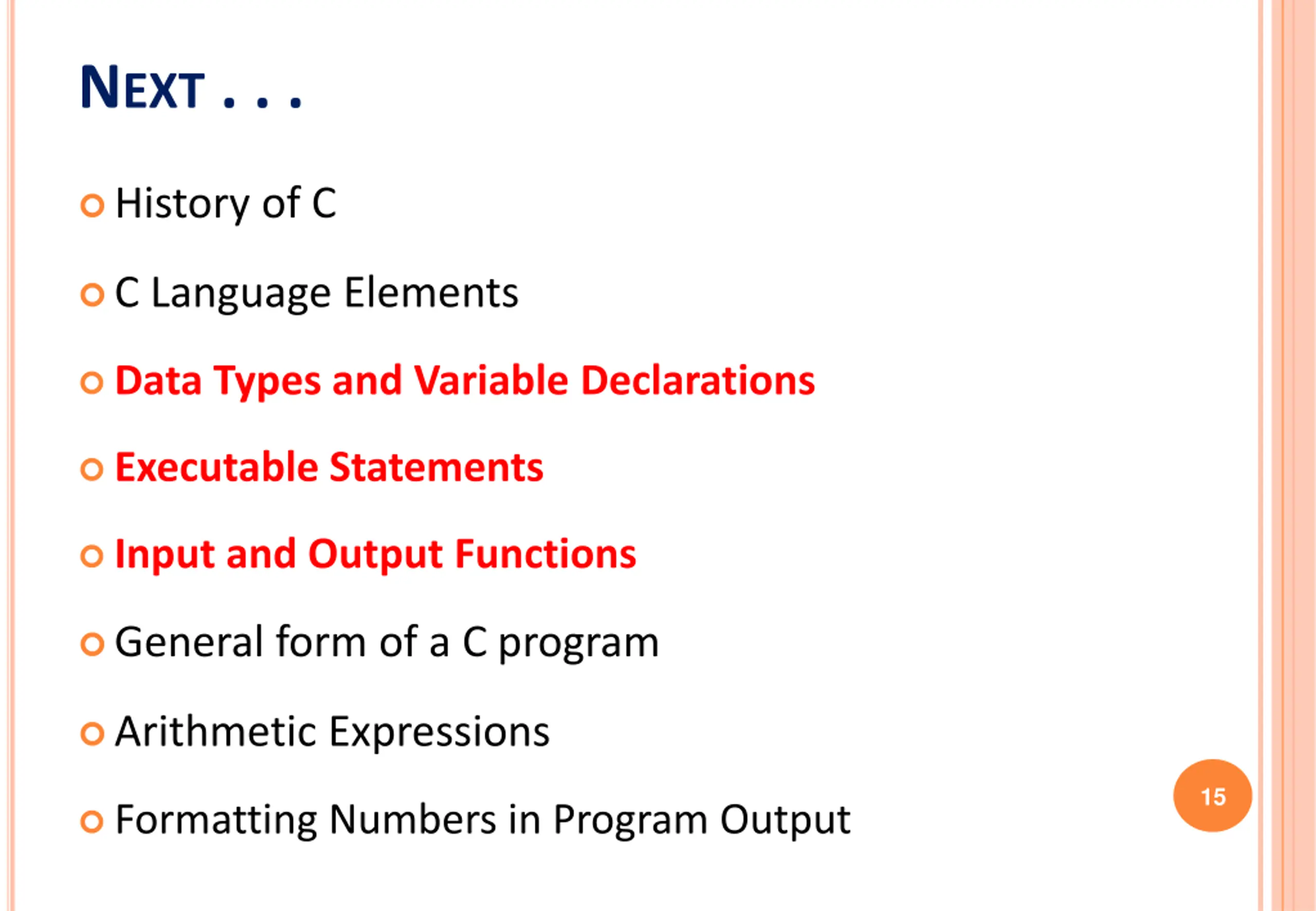 NEXT . . . History of C C Language Elements Data Types and Variable Declarations Executable Statements Input and Output Functions General form of a C program Arithmetic Expressions 15 Formatting Numbers in Program Output