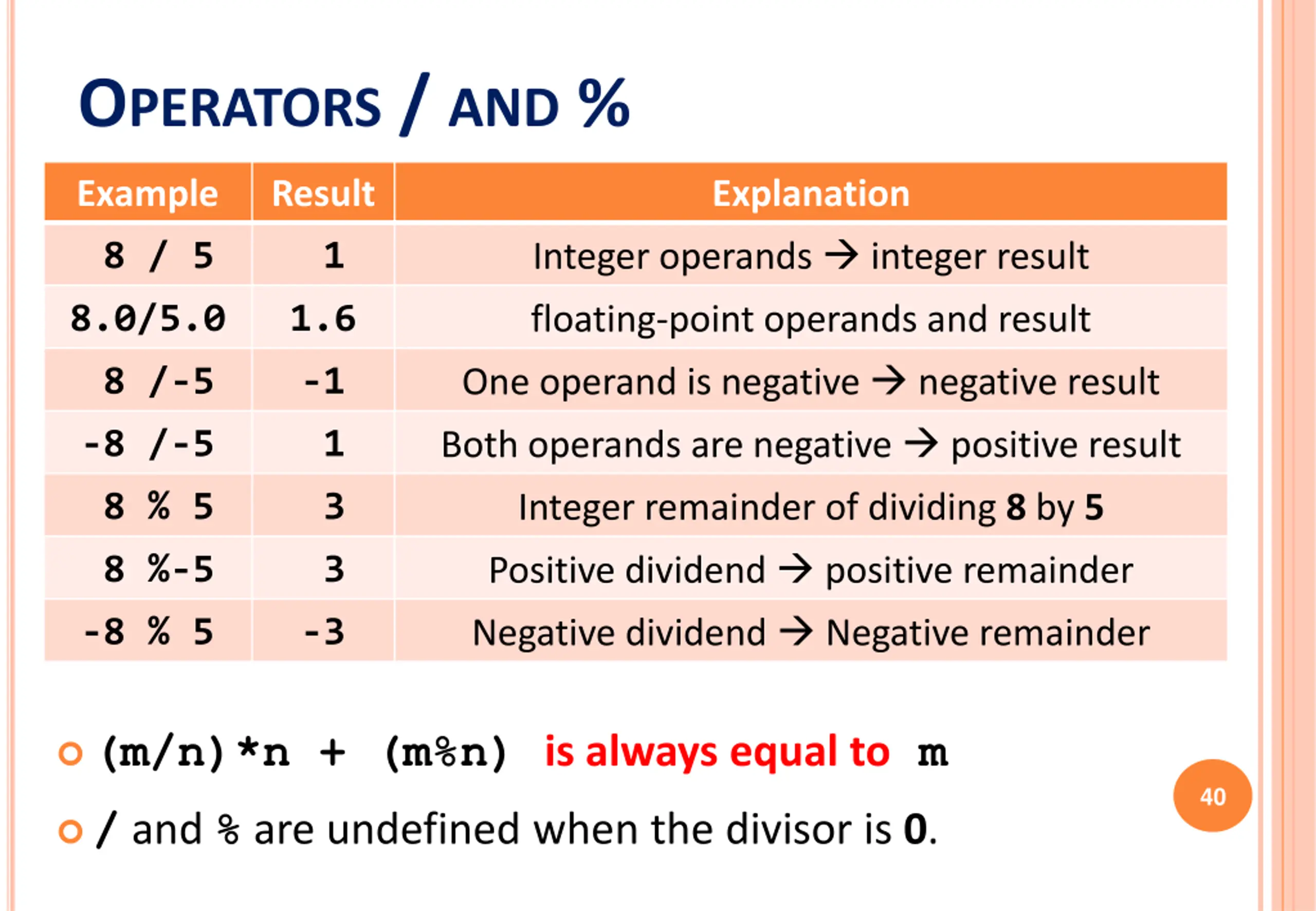 OPERATORS / AND % Example Result Explanation Integer operands integer result 8 / 5 1 8.0/5.0 1.6 floating-point operands and result One operand is negative negative result Both operands are negative positive result 8 /-5 -1 -8 /-5 1 8 % 5 3 Integer remainder of dividing 8 by 5 Positive dividend positive remainder Negative dividend Negative remainder 8 %-5 3 -8 % 5 -3 (m/n)*n + (m%n)is always equal tom 40 / and % are undefined when the divisor is 0.