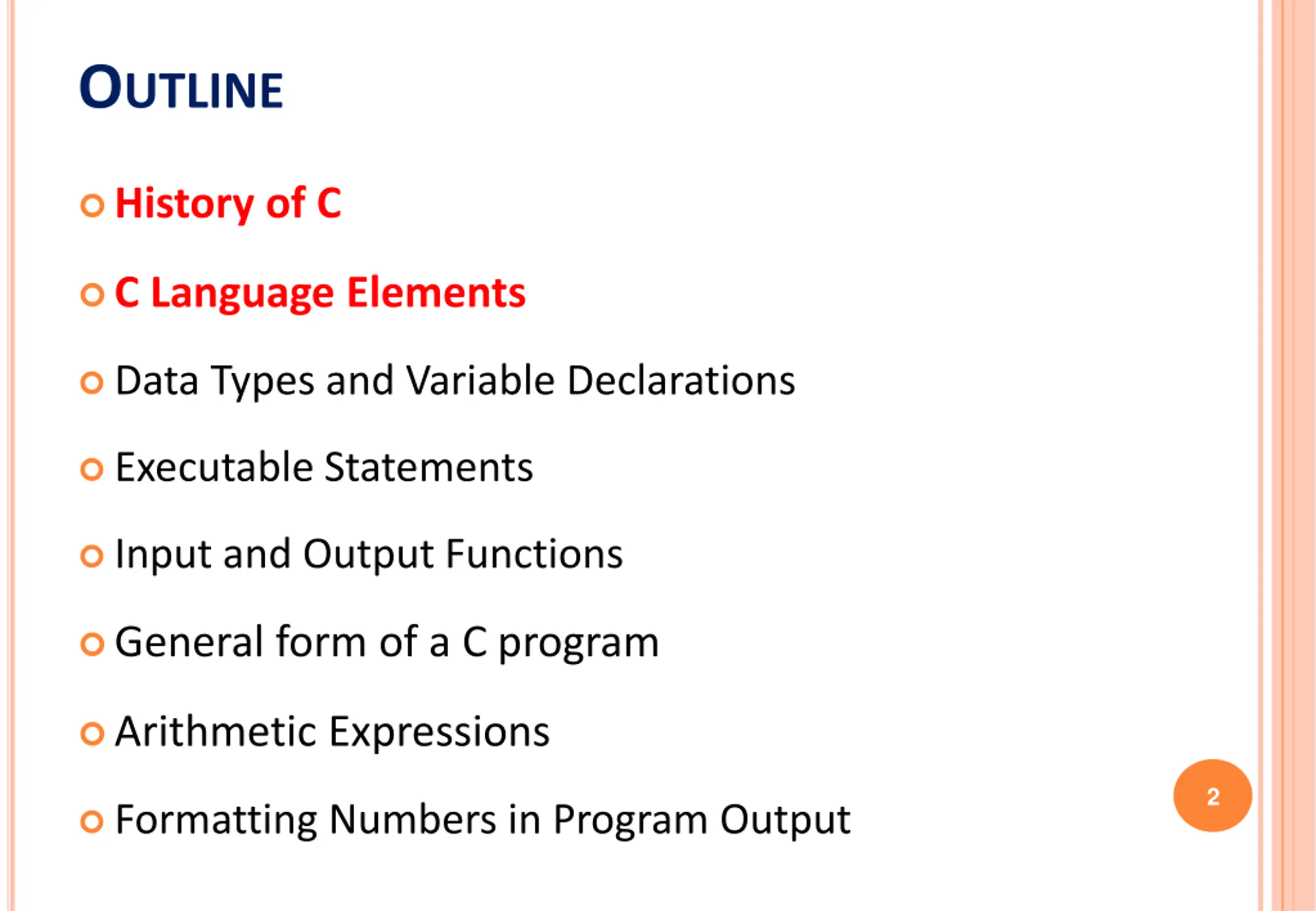 OUTLINE History of C C Language Elements Data Types and Variable Declarations Executable Statements Input and Output Functions General form of a C program Arithmetic Expressions 2 Formatting Numbers in Program Output