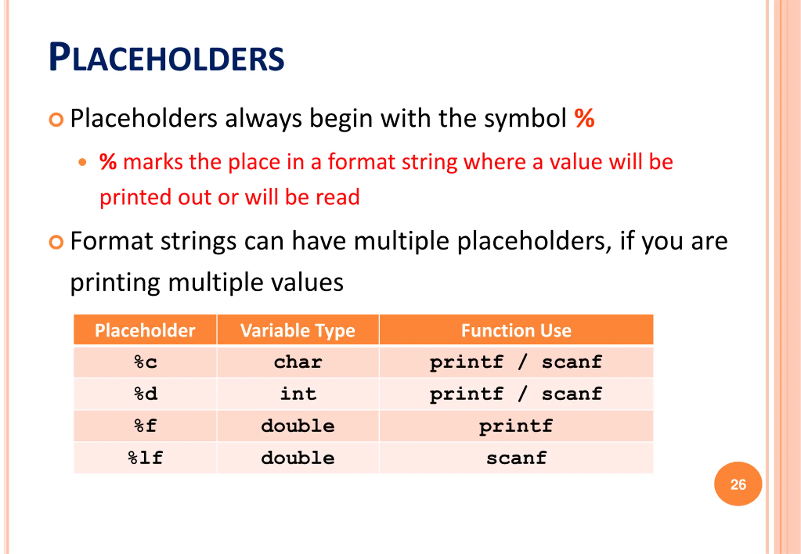 PLACEHOLDERS Placeholders always begin with the symbol % % marks the place in a format string where a value will be printed out or will be read Format strings can have multiple placeholders, if you are printing multiple values Placeholder %c %d %f %lf Variable Type char int double double Function Use printf / scanf printf / scanf printf scanf 26