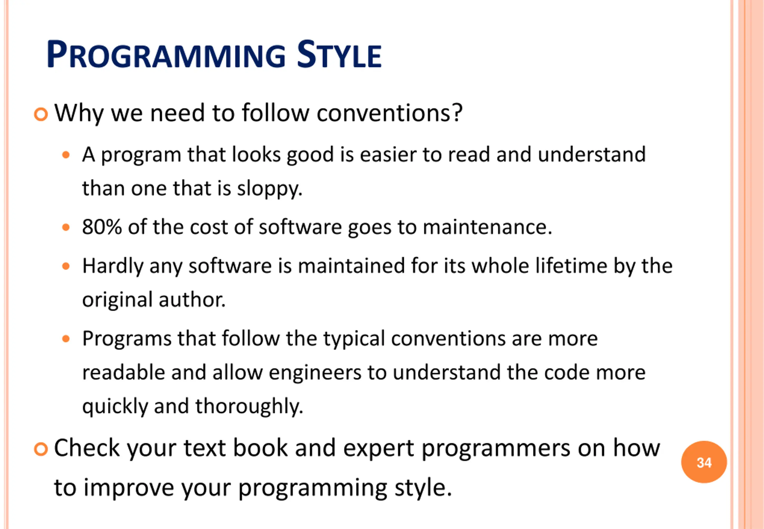 PROGRAMMING STYLE Why we need to follow conventions? A program that looks good is easier to read and understand than one that is sloppy. 80% of the cost of software goes to maintenance. Hardly any software is maintained for its whole lifetime by the original author. Programs that follow the typical conventions are more readable and allow engineers to understand the code more quickly and thoroughly. Check your text book and expert programmers on how to improve your programming style. 34