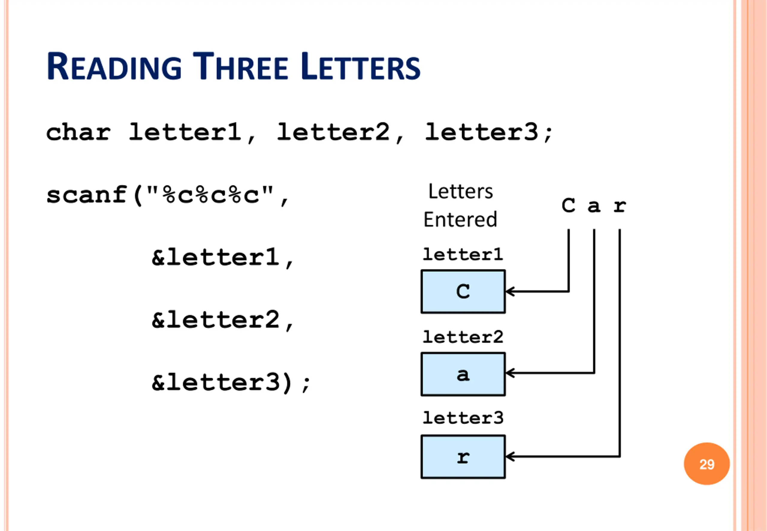 READING THREE LETTERS char letter1, letter2, letter3; scanf("%c%c%c", Letters Entered C a r &letter1, letter1 C &letter2, letter2 a &letter3); letter3 r 29