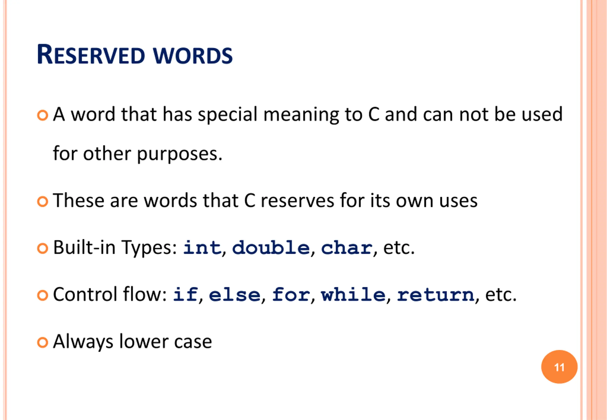 RESERVEDWORDS A word that has special meaning to C and can not be used for other purposes. These are words that C reserves for its own uses Built-in Types: int, double, char, etc. Control flow: if, else, for, while, return, etc. Always lower case 11