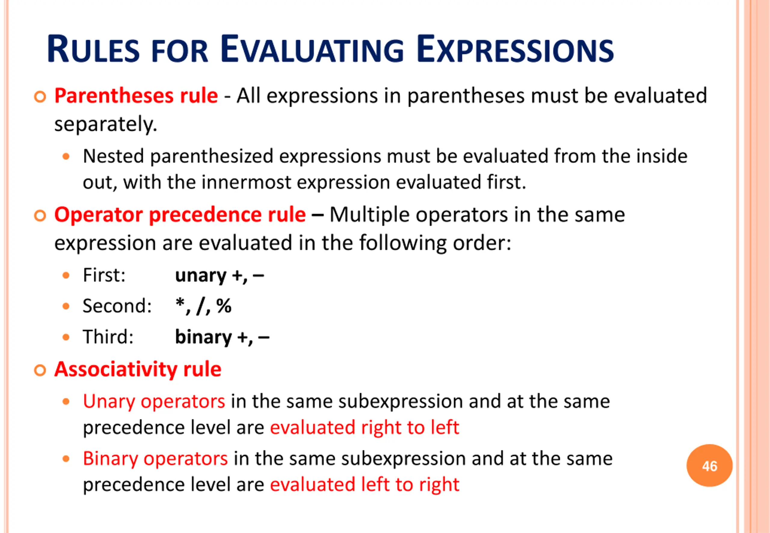 EXPRESSIONSWITH MULTIPLE OPERATORS Operators are of two types: unary and binary Unary operators take only one operand Unary minus (-) and Unary plus (+) operators Binary operators take two operands Examples: addition (+), subtraction ( ), multiplication (*), division (/) and integer remainder (%) operators A single expression could have multiple operators Example: -a + b*c d/2 45