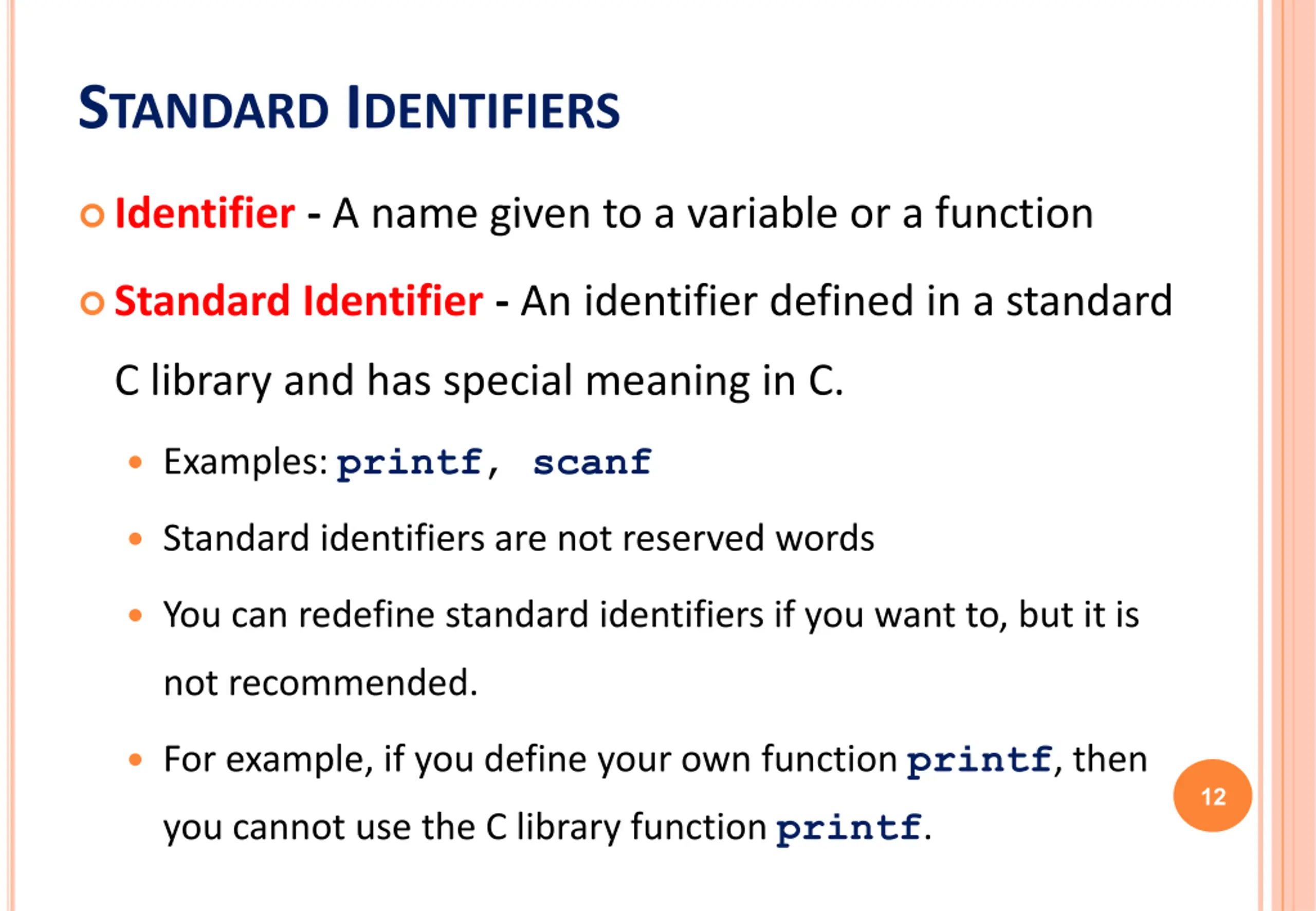 STANDARD IDENTIFIERS Identifier - A name given to a variable or a function Standard Identifier - An identifier defined in a standard C library and has special meaning in C. Examples: printf, scanf Standard identifiers are not reserved words You can redefine standard identifiers if you want to, but it is not recommended. For example, if you define your own function printf, then 12 you cannot use the C library function printf.