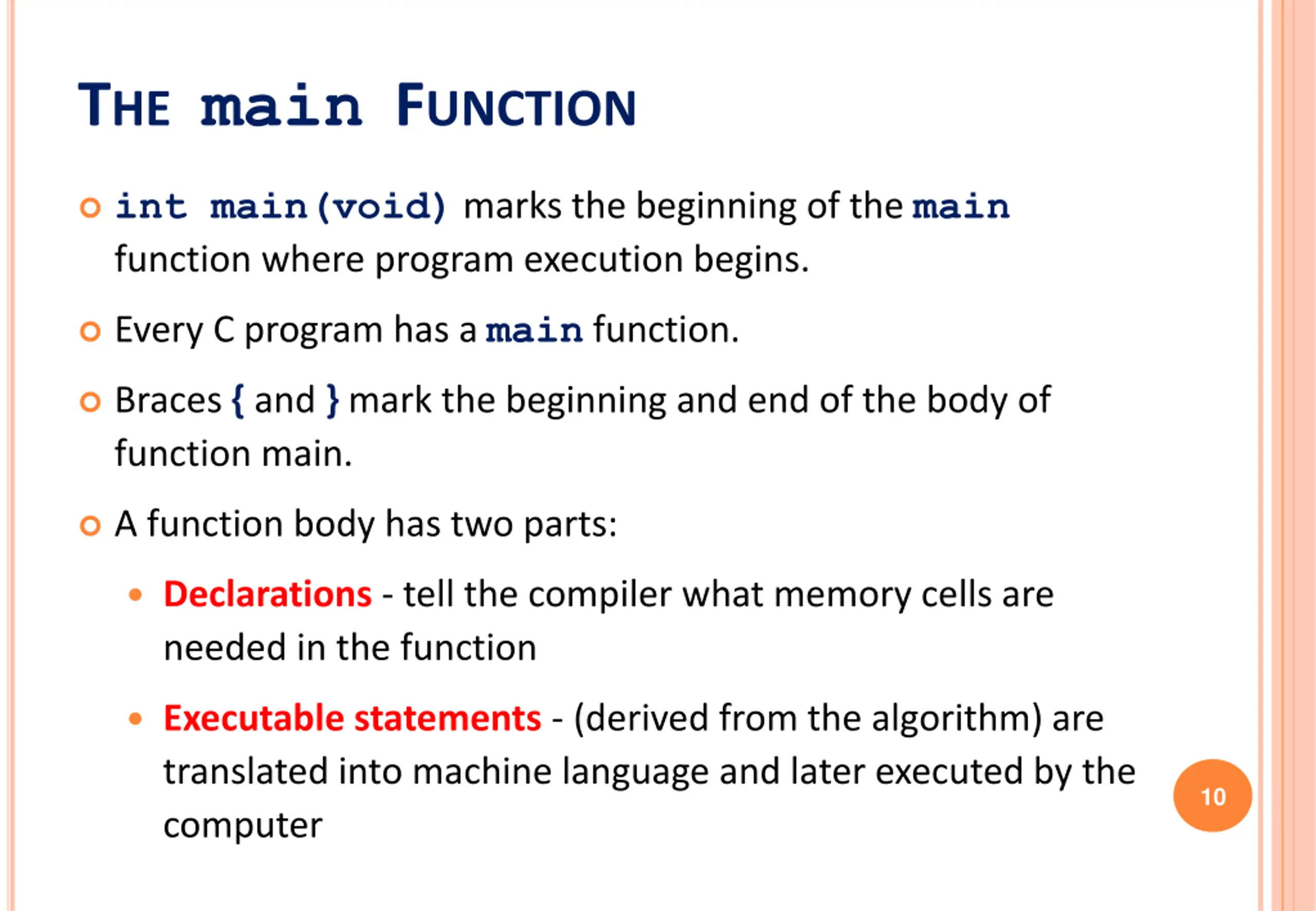 THEmain FUNCTION int main(void)marks the beginning of the main function where program execution begins. Every C program has a main function. Braces { and } mark the beginning and end of the body of function main. A function body has two parts: Declarations - tell the compiler what memory cells are needed in the function Executable statements - (derived from the algorithm) are translated into machine language and later executed by the computer 10